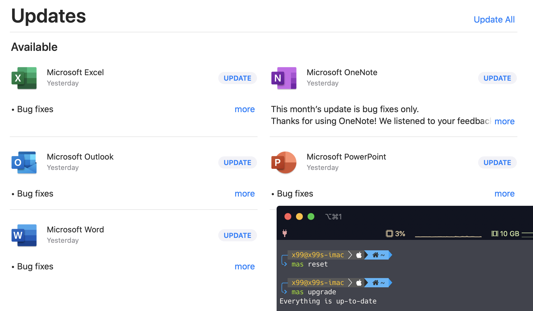 Hi everyone. Lately I found out that mas doesn't upgrades anything, although some upgrades exist in AppStore: <img width="923" alt="Screenshot 2019-11-15 at 10 22 11" src="https://user-images.githubusercontent.com/4655239/68931905-d0071980-0791-11ea-9fdf-63f3560f5178.png"> My environment: - macOS Catalina 1015.1 - mas 1.6.3, installed from brew Thanks a lot for your help