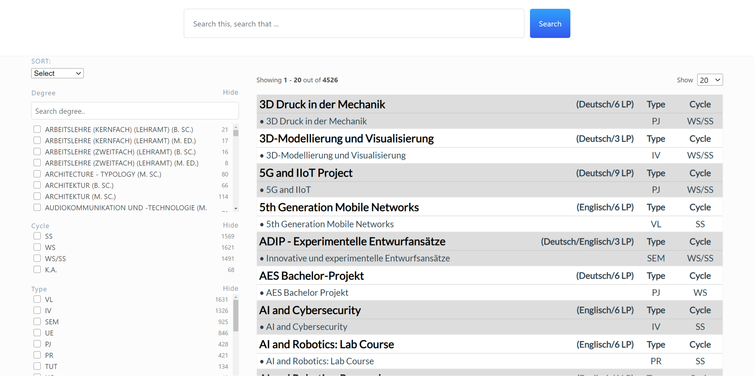 Filter modules by degree, cycle, type, ects, department and method of examination.