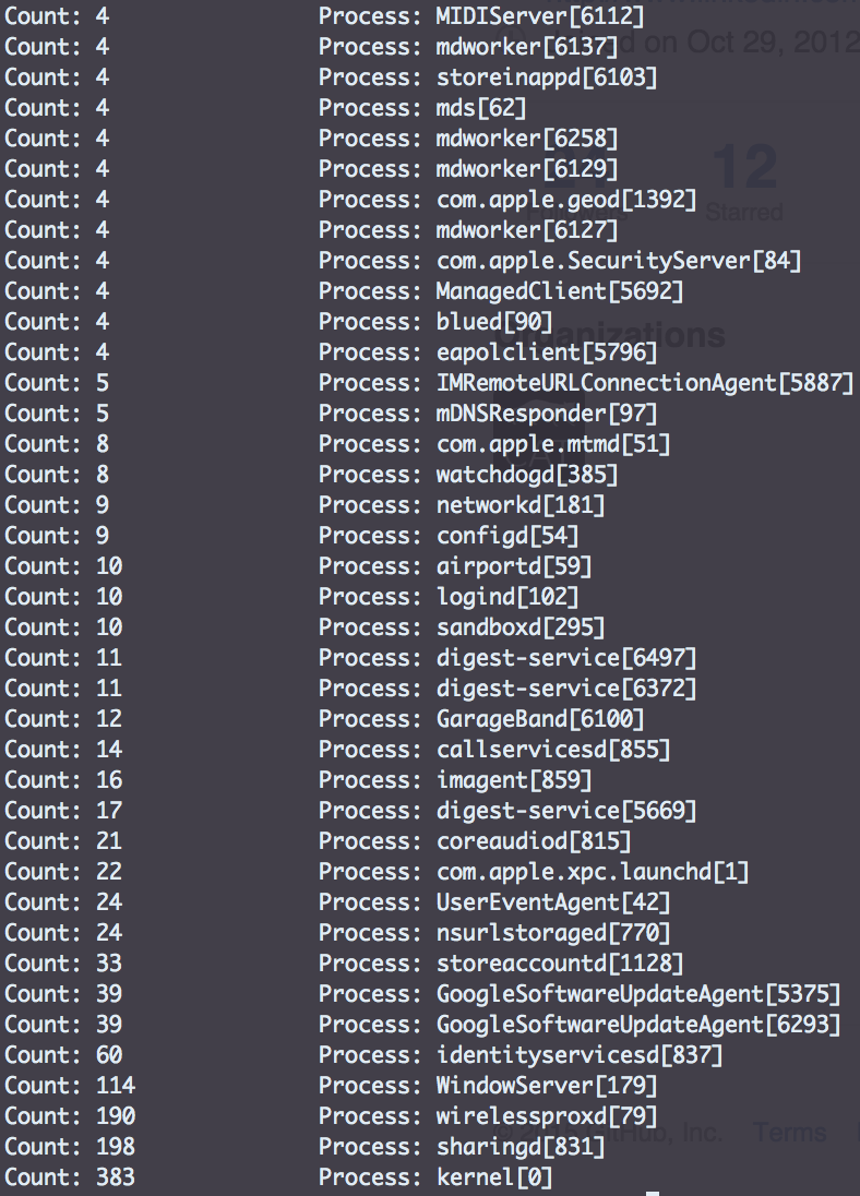 syslogparser A simple python script to parse system log files and output each process's number of occurences in that particular log file Usage ./syslogparser.py <path to log file> Example ./syslogparser.py "/var/log/system.log" Example of output: