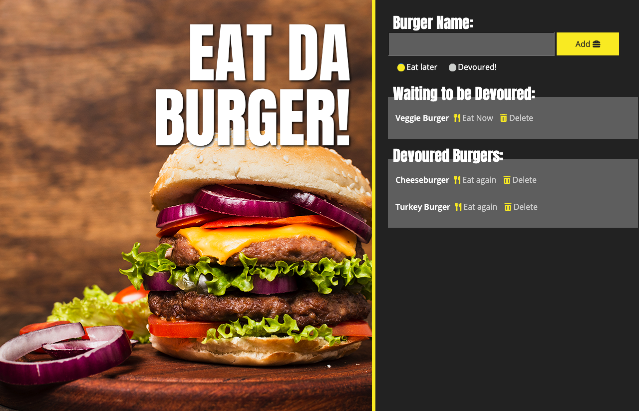 In this application, the user will be able to add a burger, to be "eaten later" or "devoured". With options to "eat now" or "delete" any burger in the waiting to be devoured box. And has options to "eat again" or "delete" any burger in the devoured burgers box. This app uses MySQL, Node, Express, Handlebars and an ORM.