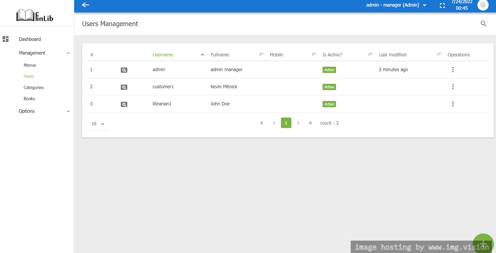- librarian (can borrow a book to a customer) (user:librarian1 pwd:123qwe!@#QWE)