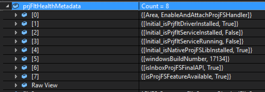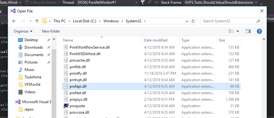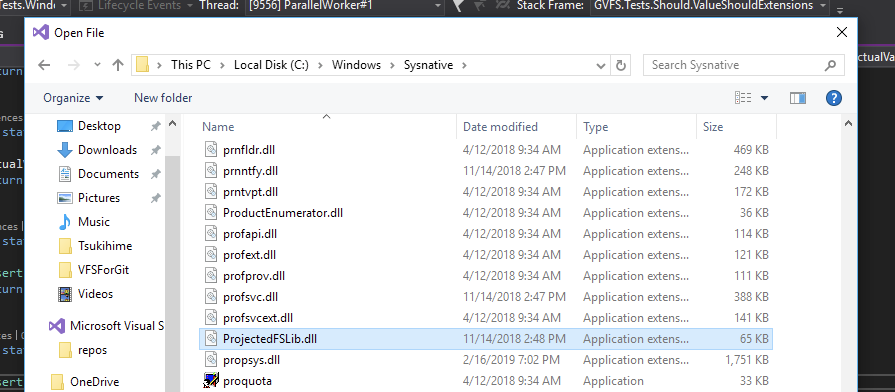 I suspect so -- VS is running in 32-bit mode, and from its perspective, there is no ProjectedFSLib.dll in System32: But it can be seen in Sysnative: The Windows I'm running is Windows 10 Pro (x64), version 1803, OS build 17134.706. Latest logs from a test run failure are here: https://gist.github.com/kivikakk/777c37d27a3b3ee21f37165d589037ba |