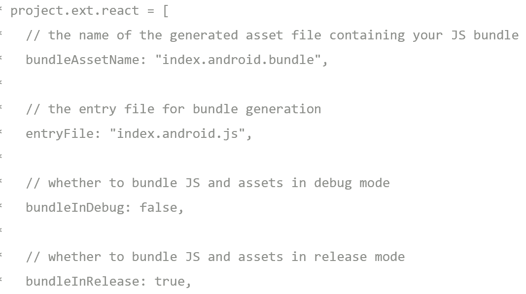 - Android allows complex setting in project.ext.react like below (from https://www.skptricks.com/2019/06/react-native-generate-release-apk-file.html)