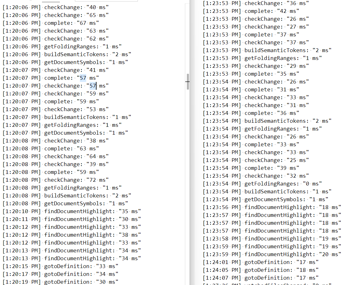 It also becomes apparent that parsing is already quite fast and the features that were only parsing and visiting the syntax tree for a single document (e.g. semantic-tokens, folding) didn't have much to gain for reasonably sized documents. The biggest win is on features like goto-definition, find-references, document-highlight that run on unchanged programs but need a full compilation.