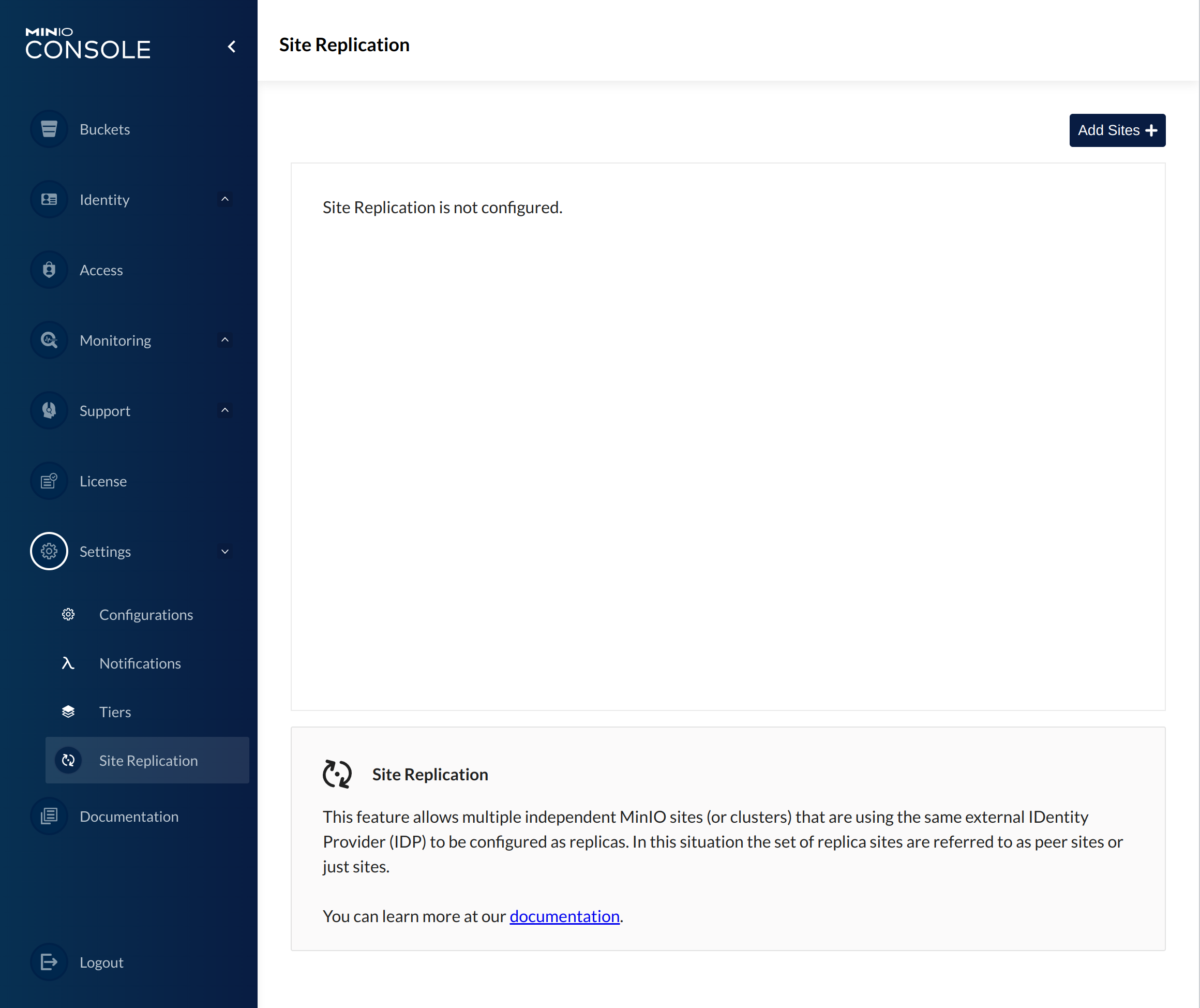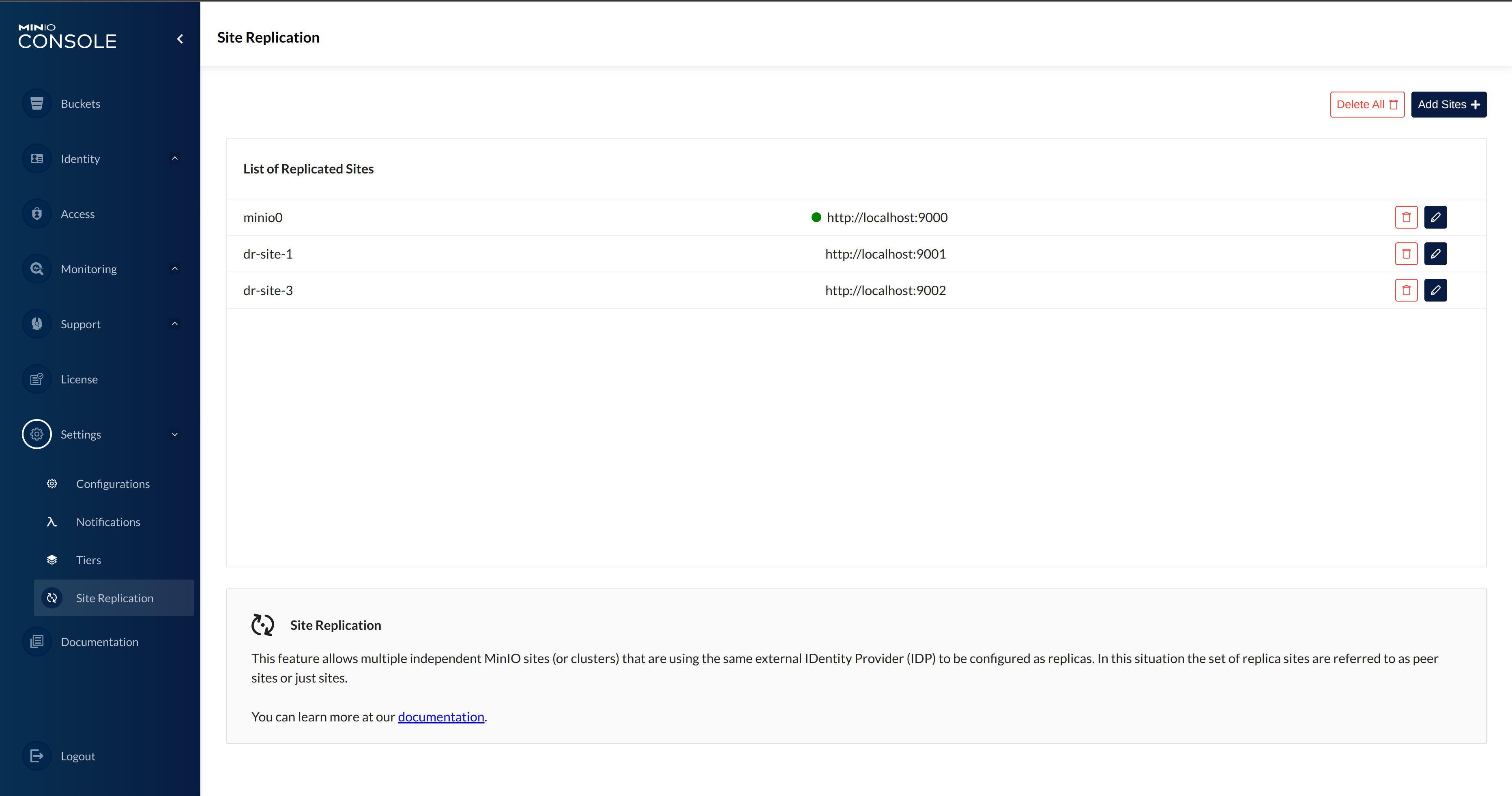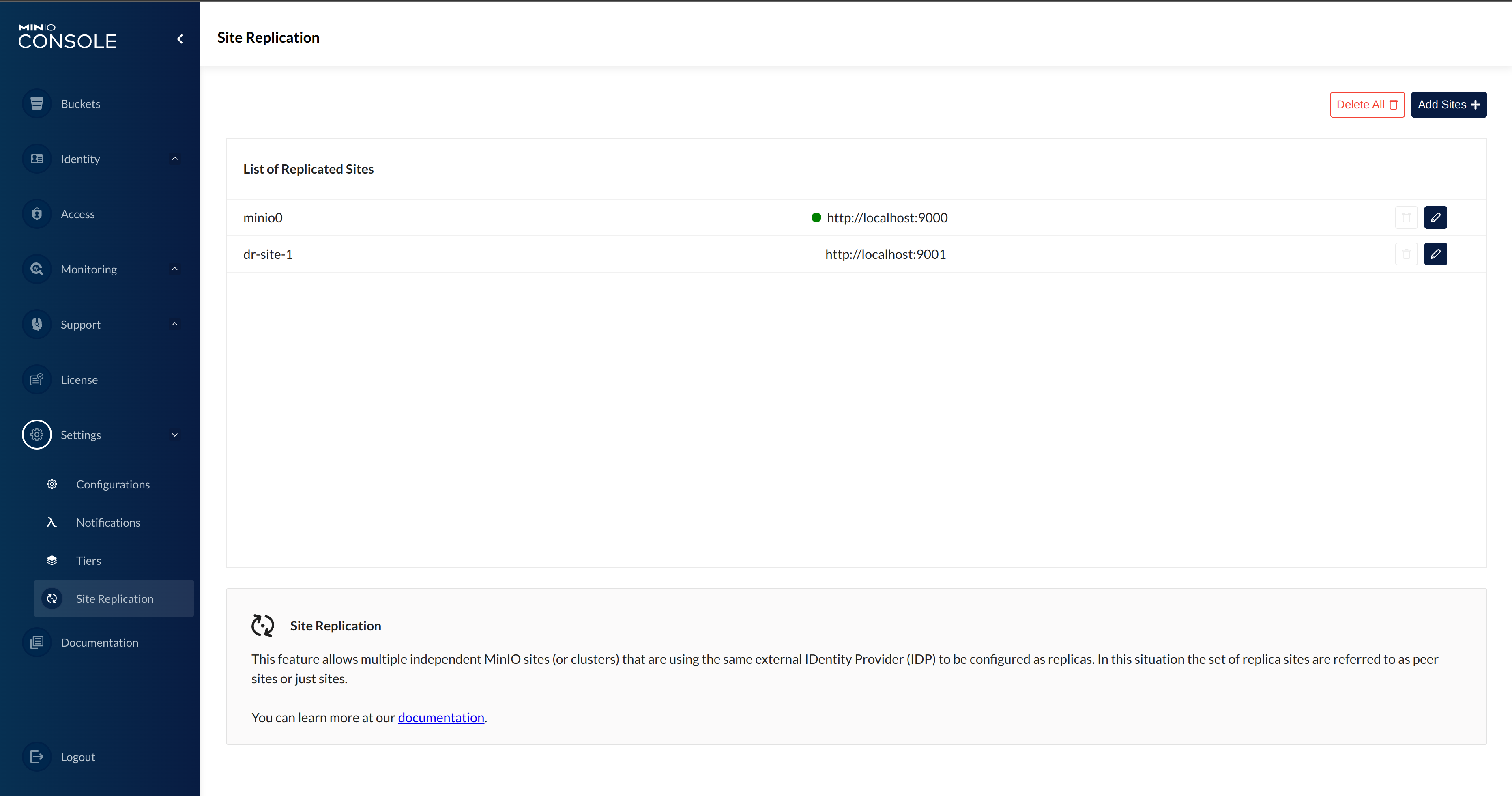 Site Replication status would be in a new PR.