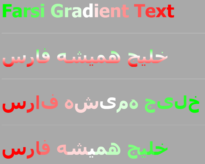 FarsiGradJS is a JavaScript library for making Persian (Farsi) or Arabic gradient colored text in web pages or any other technologies that supports HTML syntax.