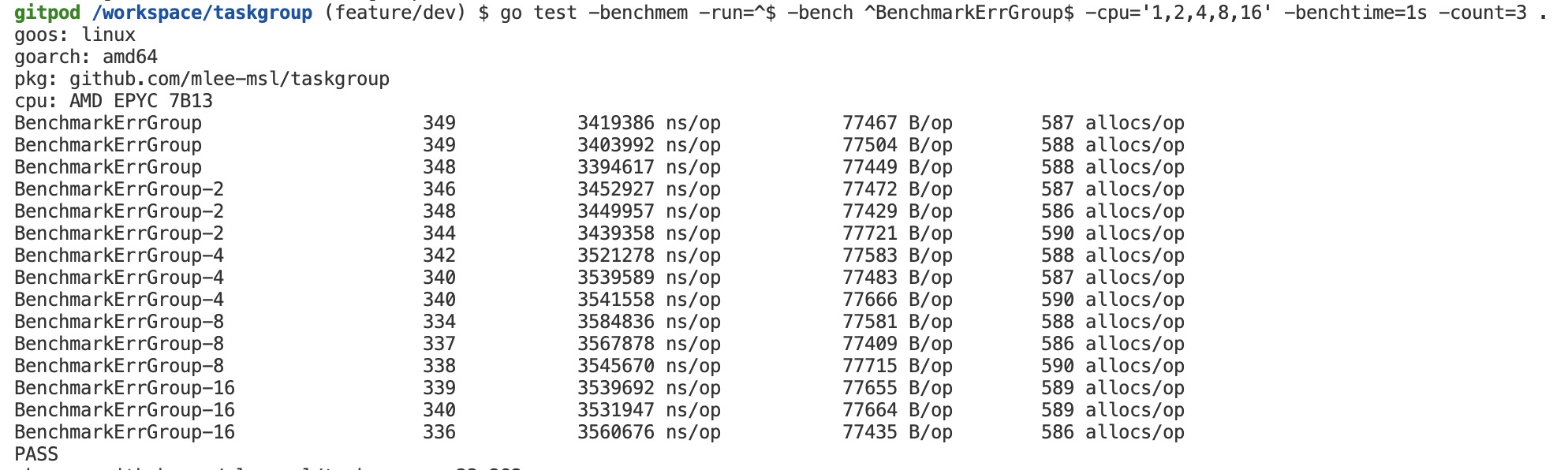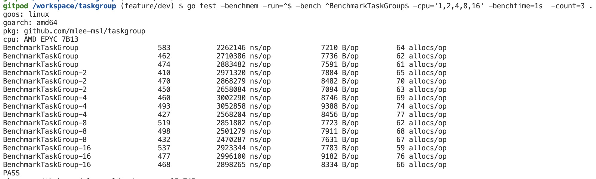 go test -benchmem -run=^$ -bench ^BenchmarkTaskGroup$ -cpu='1,2,4,8,16' [-benchtime=10x|-benchtime=1s] -count=3 -mutexprofile='mutex.pprof' .