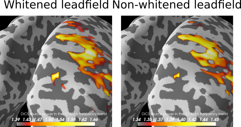 I have tested the whitening also on some other data we have internally (cannot share) that is more noisy and with smaller effect sizes. For that case, whitening the leadfield "explodes" the result. Not whitening the leadfield gives sensible results. Evidence is accumulating against whitening the leadfield... |