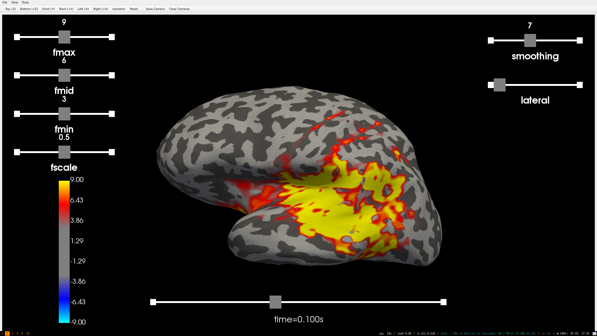 A really cool thing would be a multi-point bar where you could set fmin/fmid/fmax all on the same bar, where the bottom was the data min and top was data max. But I assume this is not a widget that VTK has. You could move the fmin/fmid/fmax/fscale to the right. Then the colorbar can stay to the left. You're going to be separating them anyway, and it's potentially nice to have all the user controls more clustered to the right anyway. Whatever looks good in your testing is fine by me... |