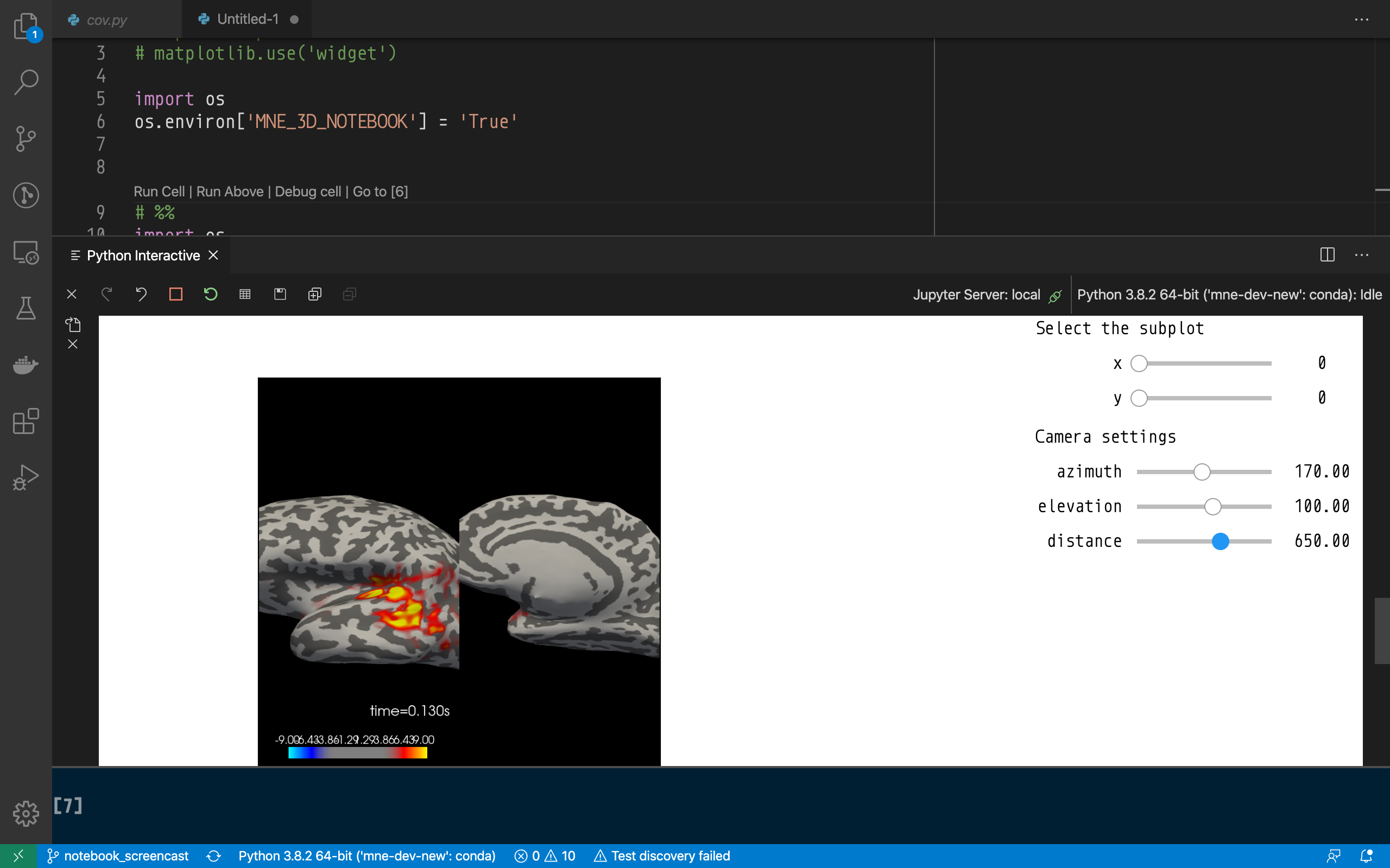 I tested and it even runs in the latest Python in VS Code Extension: There is an issue when resizing the browser window: ConcernsBackend requirementsSince rendering is done in the Data transferThere is a massive amount of data transferred: So when @agramfort said this is working surprisingly smoothly – this will only apply to running it locally. SlidersSliders are the easiest interactor widgets to get started with from a developer's POV, but at least since the time we all switched to touchscreen-based phones, separating the object to be manipulated from the control that manipulates it is not intuitive anymore. If anything, there should be a callback on the canvas or Axes that allows one to manipulate the view via click-n-drag. But that's a detail for later. ProposalSince for the time being it seems unrealistic to actually render the entire scene on the client (i.e. inside the browser), a first idea to reduce the volume of data transfer is to invoke the interactive widgets with Another idea is to make use of |
