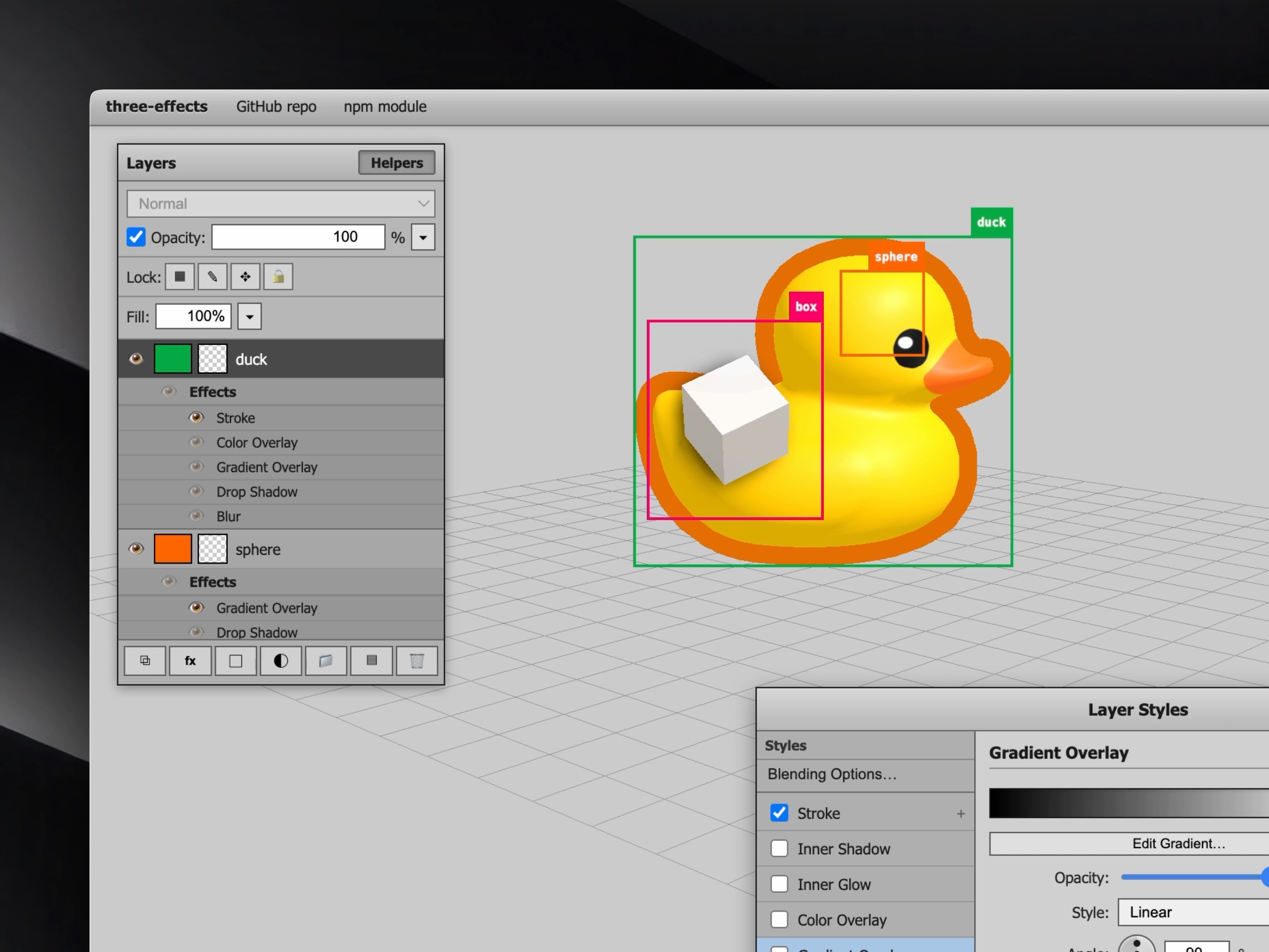 Add Photoshop-style layer effects to Three.js objects (stroke, shadows, glows, overlays and blur).