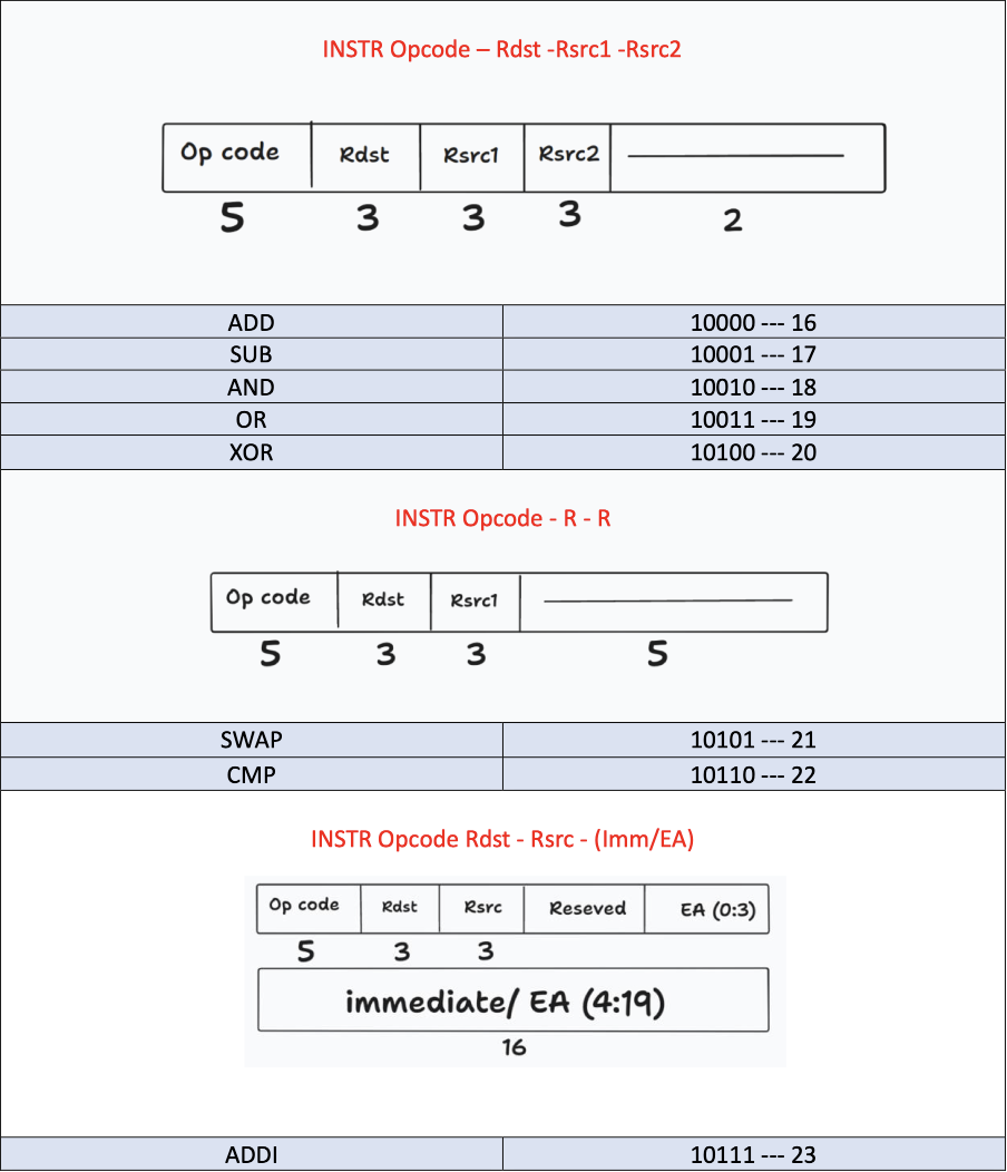 The ISA is designed with a RISC-like approach, emphasizing simplicity and efficiency. The instruction set includes various operations, and the format of instructions is illustrated in the provided images.