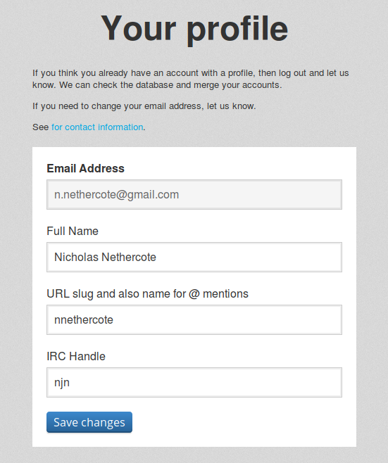 Also, this text is confusing: "If you think you already have an account with a profile, then log out and let us know. We can check the database and merge your accounts." Even once I realize this is my profile page, I'm still not quite sure what to make of that text... of course I have an account with a profile, that's what I'm looking at! Perhaps it would be clearer to say "If you think you have multiple accounts, ...".