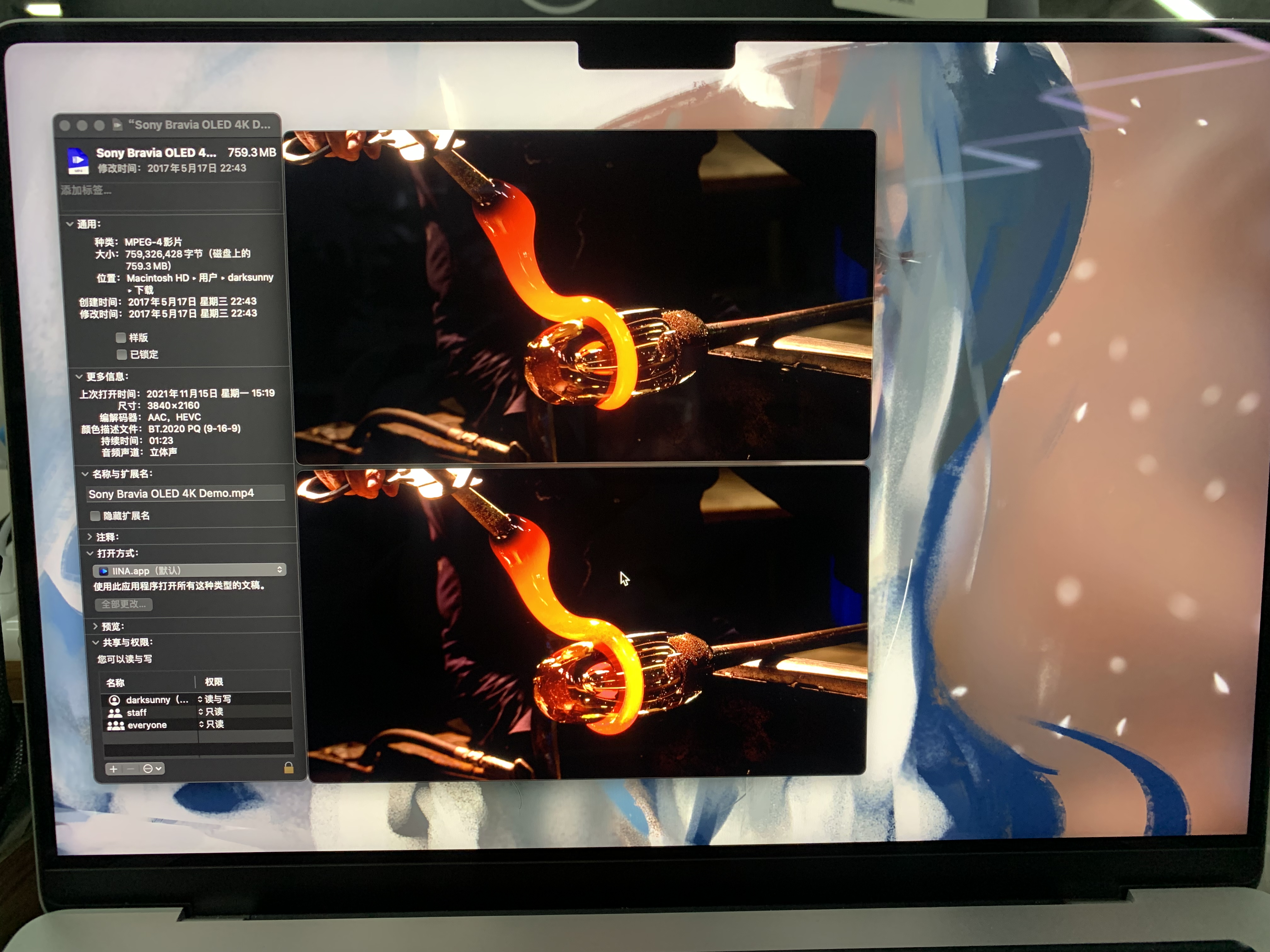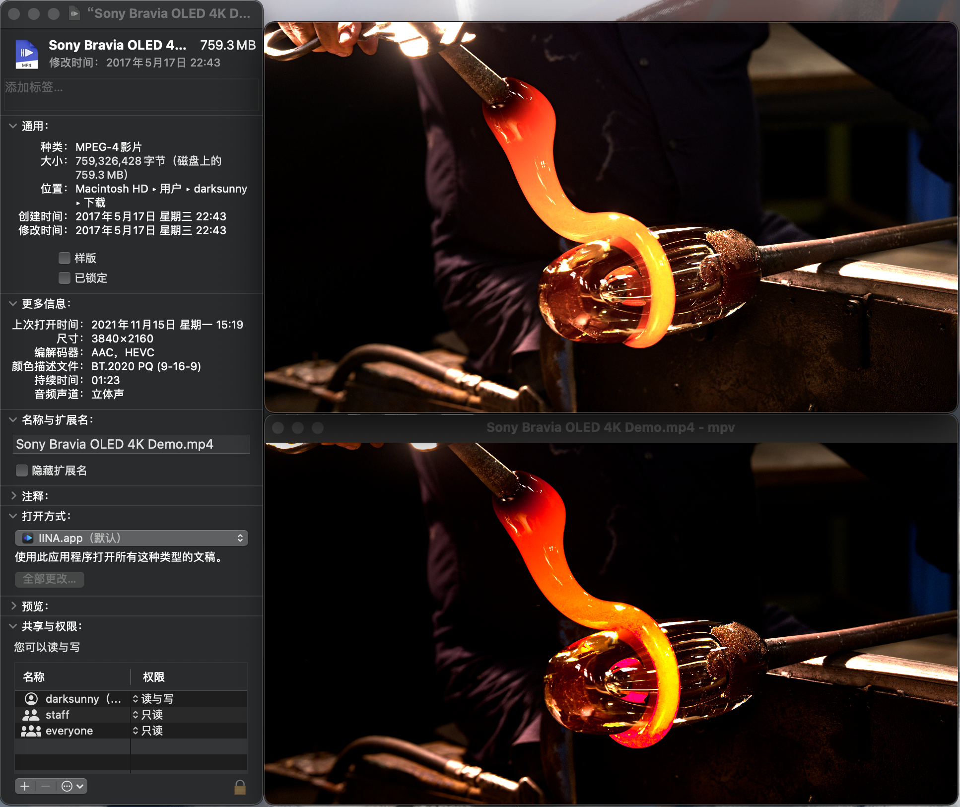 I can help to the test, M2 mini + external OLED monitor I confim the colorspace aproch is working, setting target colorspace to itur2100PQ, (displayP3_PQ gives wrong color) here is my setting vo=libmpv [HDR_PQ] Issue is wrong white point, i attached a comparison , the highlights of MPV are over exposed, and grey level is incorrect as well |