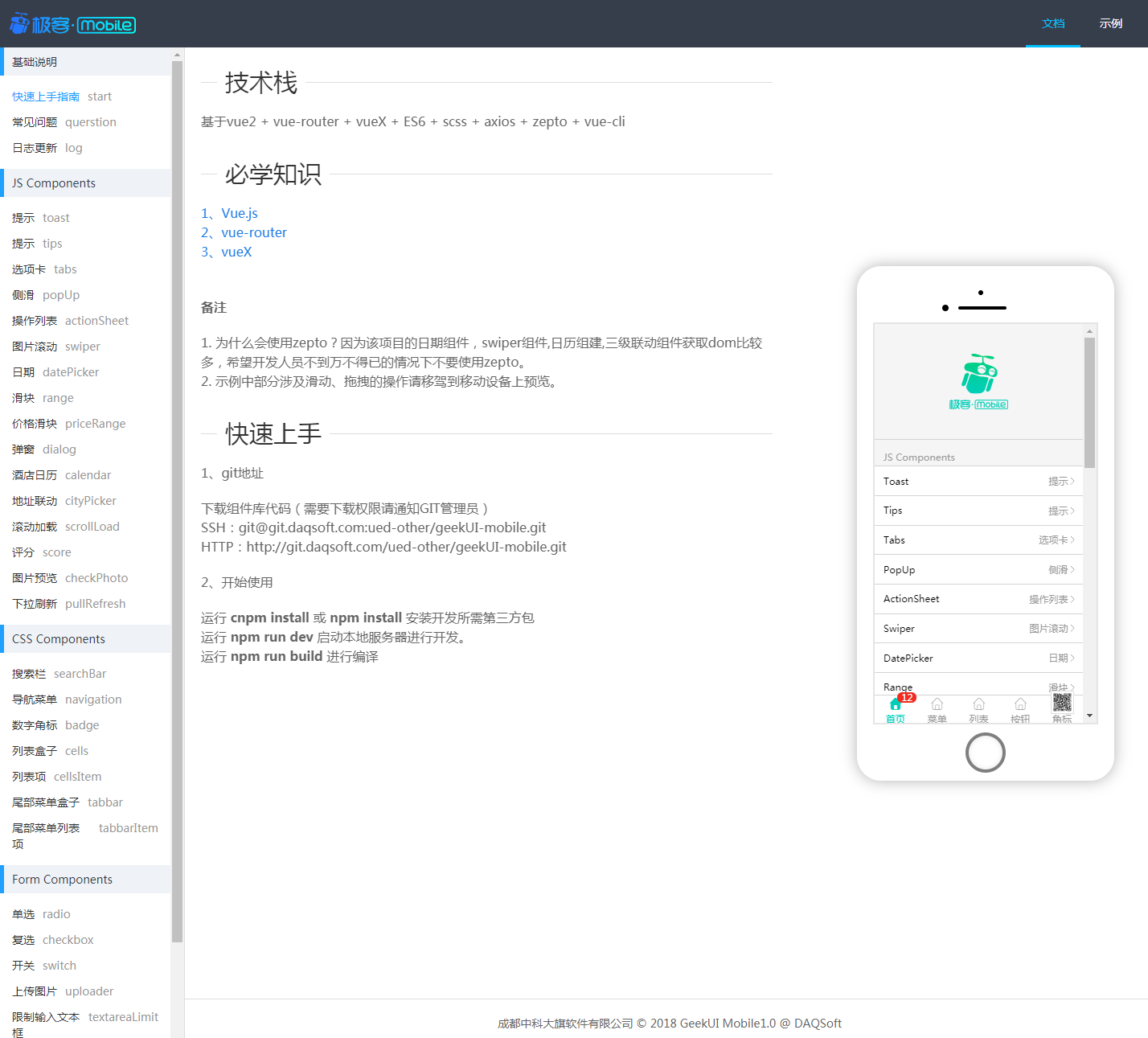 在线文档http://s.ued.daqsoft.com/geekUI/mobile/api/#/home