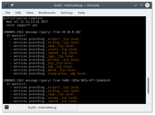 This simple application uses the QMdnsEngine library to monitor mDNS traffic travelling through the network.