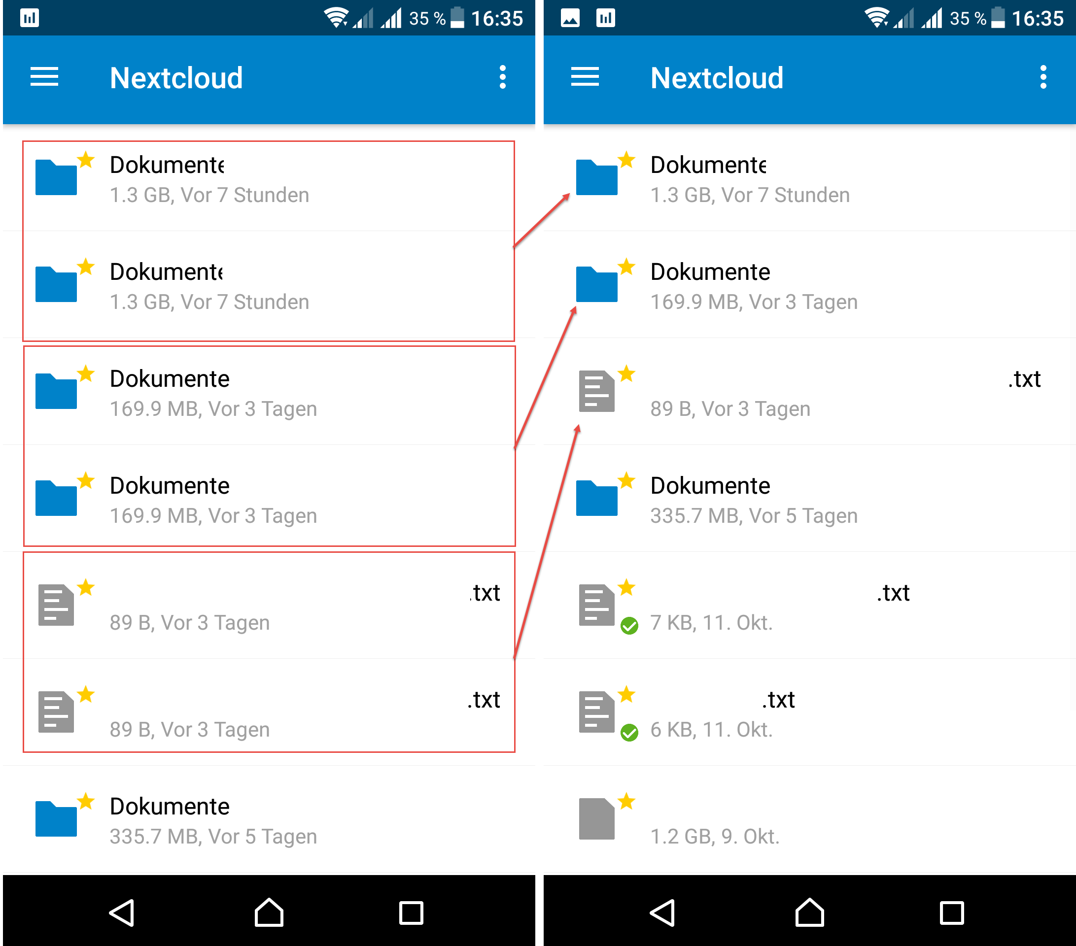 ### Actual behaviour - Every time if i open the favorites Page i see all items twice. ### Expected behaviour - If i open the favorites page, i would only see every item once ### Steps to reproduce 1. open Nextcloud Add - select favorites > all items visible twice ### Environment data Android version: 7.1.1 Device model: Sony Xperia Z5 dual Stock or customized system: Stock ROM Nextcloud app version: 2.0.0 RC9 & 2.0.0 (final 18.10.2017) Nextcloud server version: 12.0.3