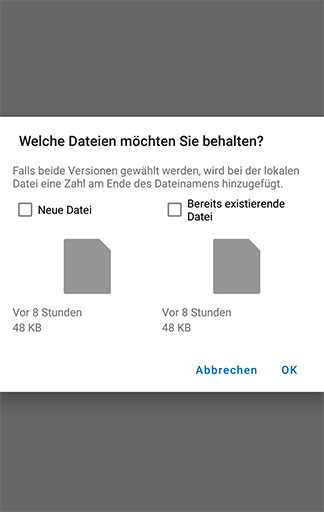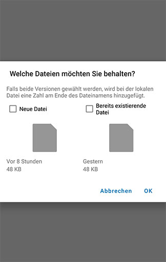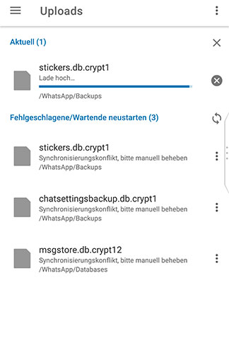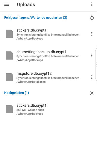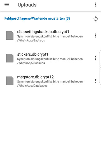 1. File version conflict appears, in this case three files from WhatsApp-Folder (ok)