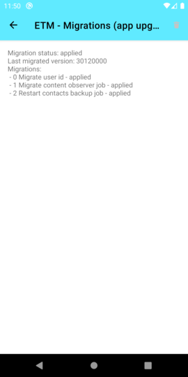 EtmBackgroundJobsFragmentwith a list of all registered jobs and handy menu where we can dump development actions. It currently allows us to cancel all tasks and toggleTestJobthat demonstrates progress indicator and is used to experiment with platform API.Migrations