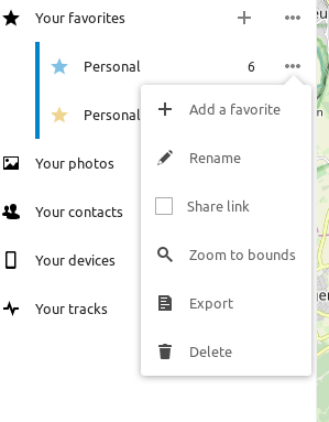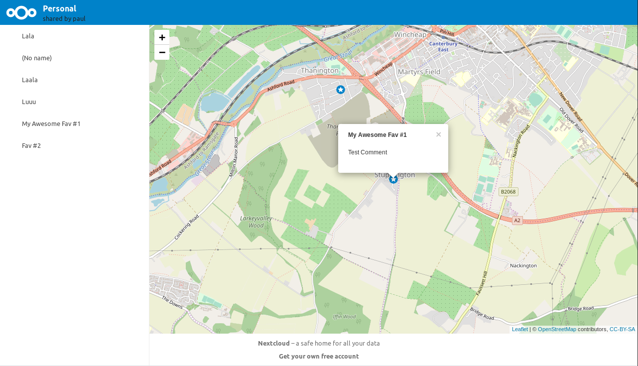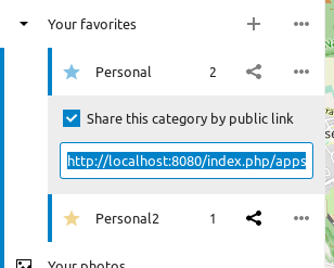Finally getting back to looking at this again, and I took the opportunity to improve the development environment repo as well. Hopefully it can help others review these kinds of pull requests more easily and robustly. If you you should get a fully functioning Nextcloud instance running locally via Docker, where the Nextcloud Docker image used is Hopefully this will provide enough flexibility and simplicity to encourage more aspiring Maps developers. (Maybe it could even be a time-saver for veterans like @eneiluj). As for the pull request itself, it all appears to work smoothly and in an interface consistent with other Nextcloud apps. I did receive several warnings during the |