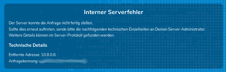 Error comes up - Internal sever error (on screen - see attachment). Logging says: