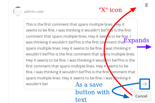I see no real need for the delete button while editing the text. How about adding a 3-dots-menu for the default view and add edit/delete to it. On the editing view we could just show the submit/cancel buttons then. |