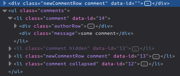 I also noticed that the .comment class is applied twice - once to the div.newCommentRow element and then again to it's li.comment children. This doesn't sound right....