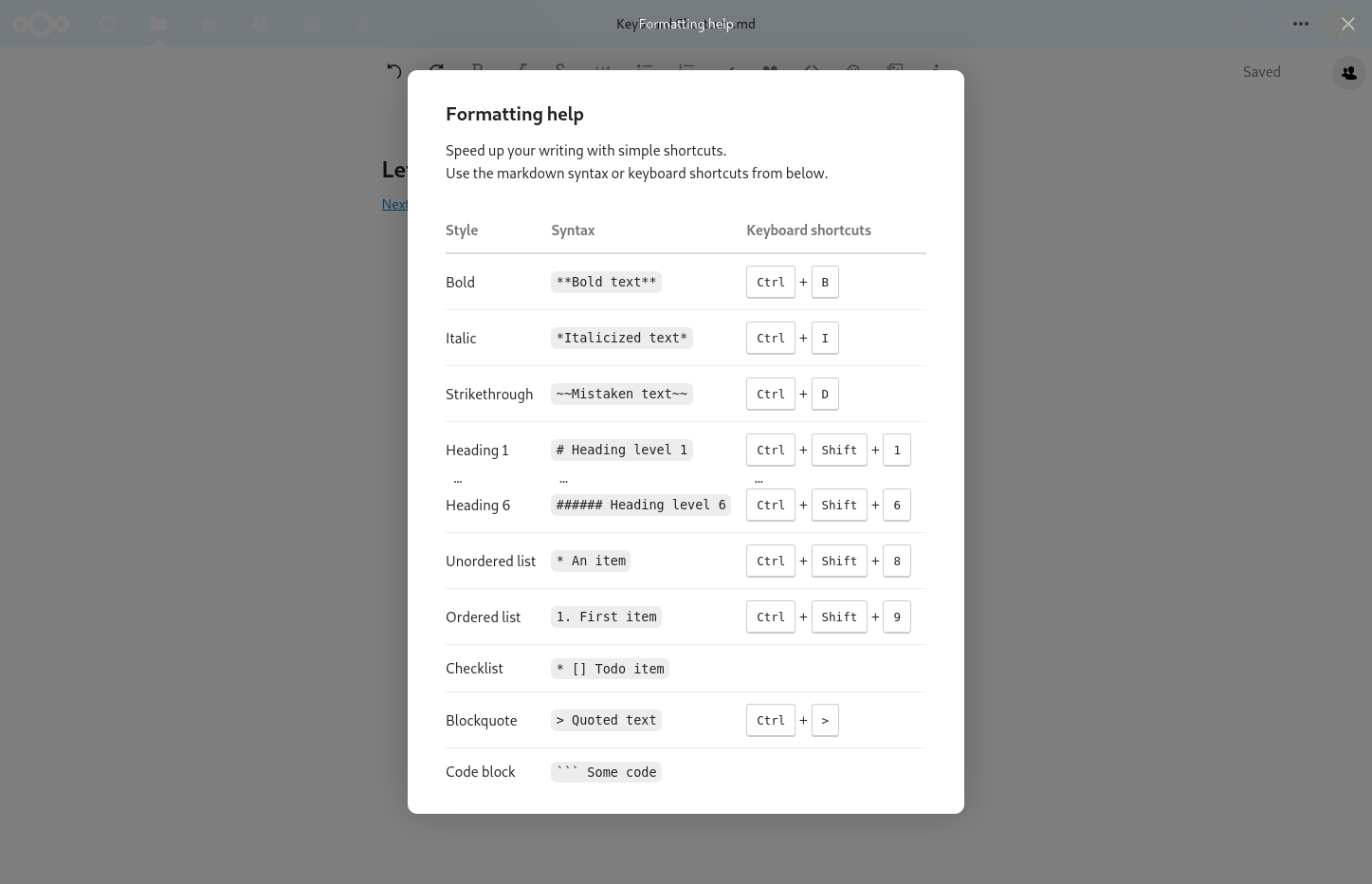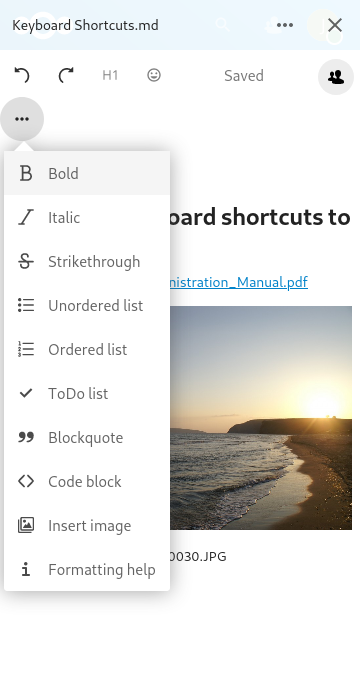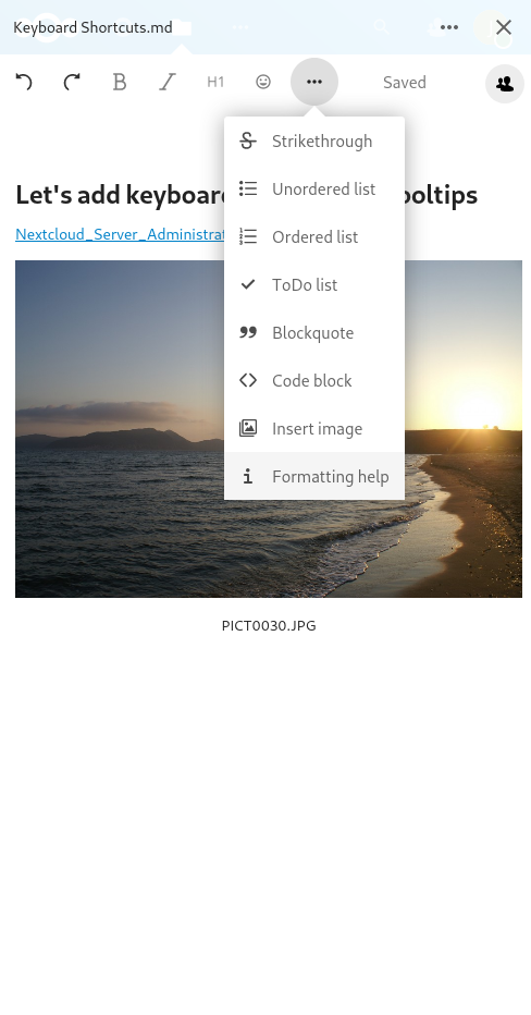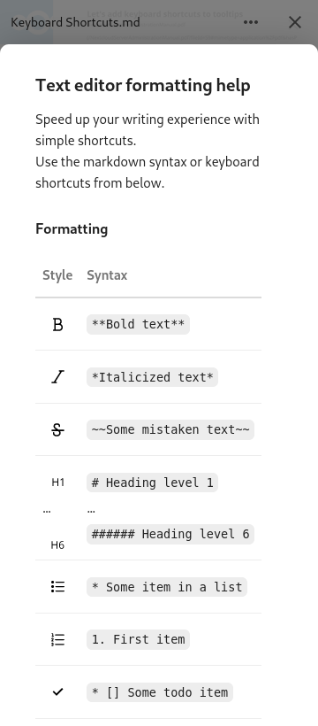 This looks great! I particularly like the i next to the save indicator as the trigger. Just a minor note: The description on mobile still talks about keyboard shortcuts. How about using the icons instead of words for the style in mobile? That would also serve as an explaination for the icons. Something like this (with the icons from the menu bar on the left obviously):