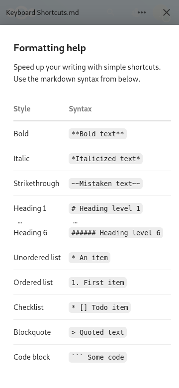 After playing around with examples below the table I finally decided to get rid of them altogether. It's just too much information for such a short overview in a modal and toggling between syntax view and formatted view really doesn't work well for formats like heading1. Especially Cc @nimishavijay |