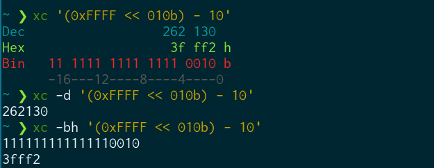 -d-h-bcontrol the output format (dec, hex and/or bin) - if none are specified, all are outputted in a pretty formatexpressionis an expression to be calculated, if one isn't given thenxcopens in interactive mode