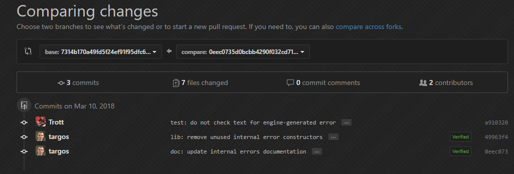 When I landed nodejs/node#19203, the generated message was Landed in 7314b17...0eec073.