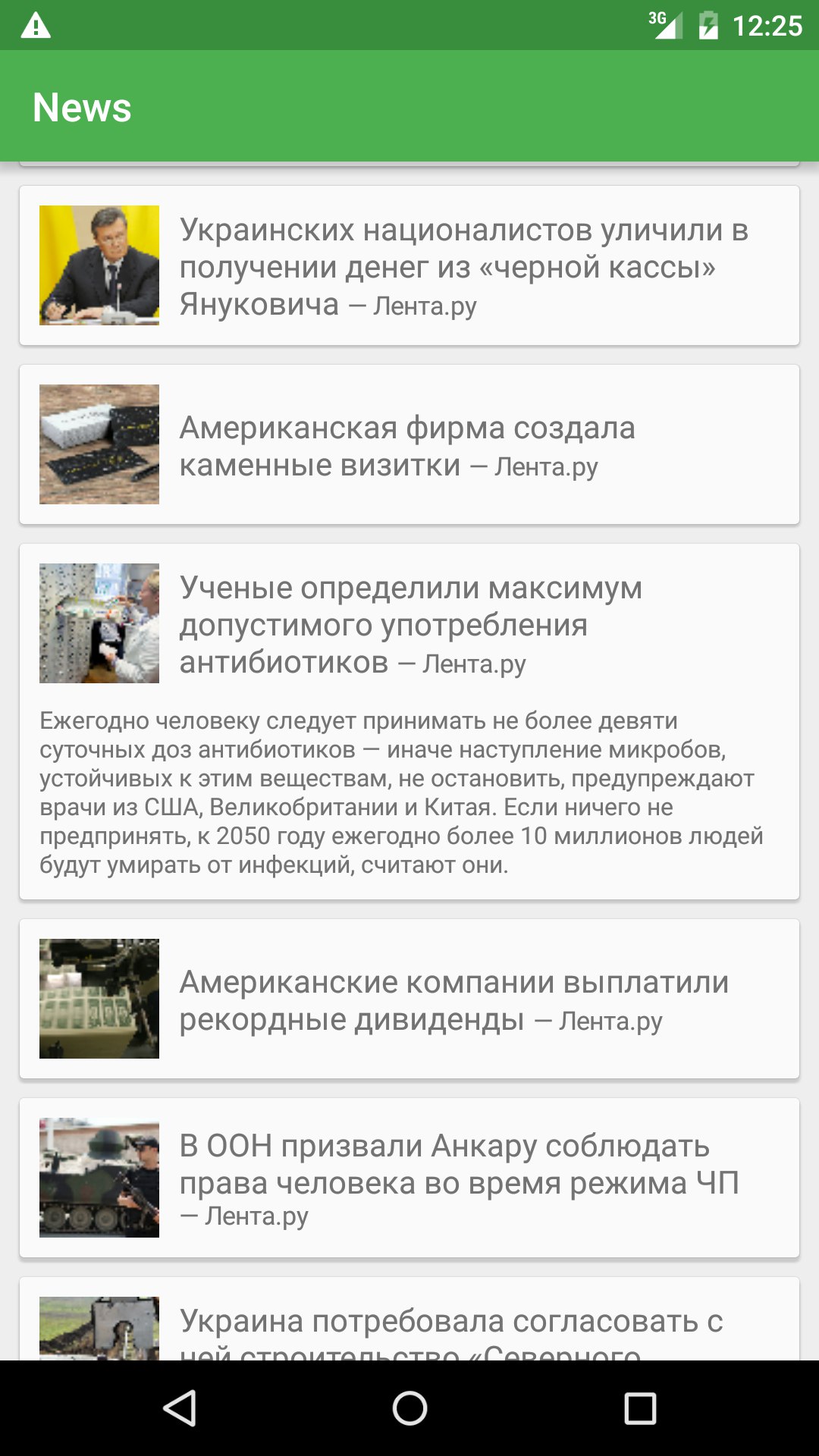 NewsTest A test Android app aggregating Lenta.ru and Gazeta.ru RSS newsfeeds ► Watch video Features: Parsing XML RSS feeds Endless List Pull to Update Smart image downloading for fast scrolling Native fade-in image animation Screenshot: