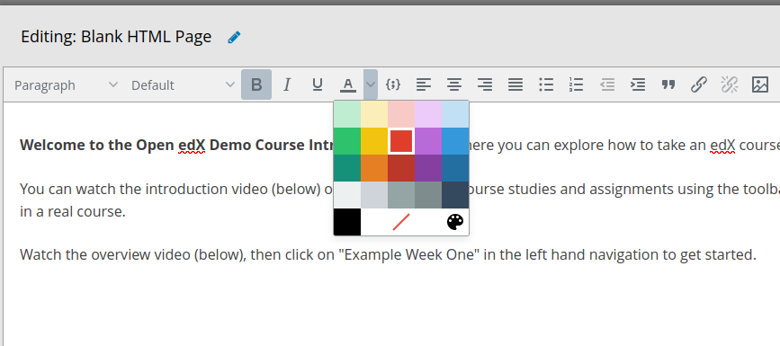 This change allows overriding all of the TinyMCE's initial configuration. The screenshots below show how the colors in the color-picker for text-color has been changed based on the example configuration given above: