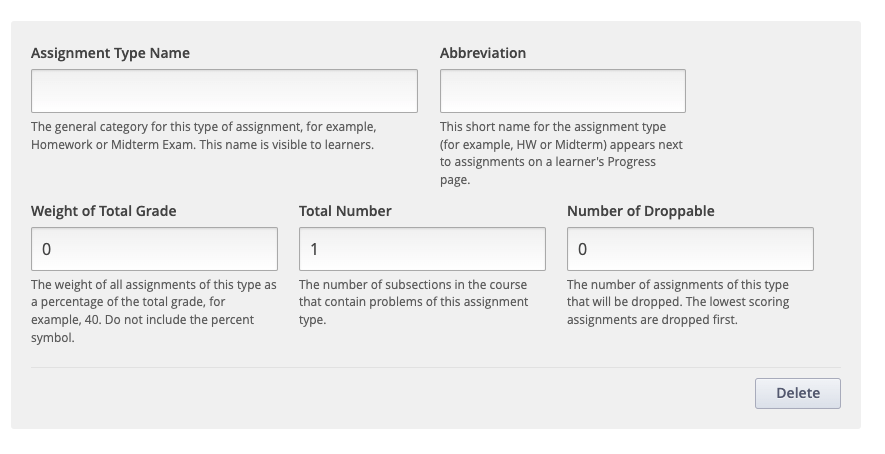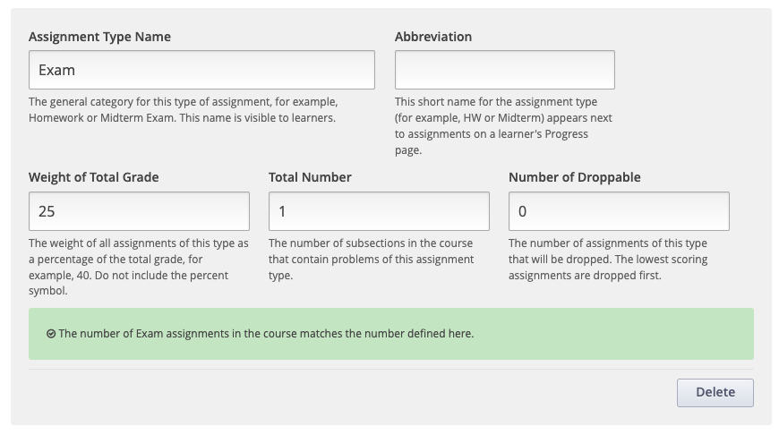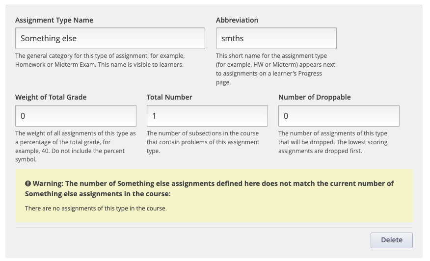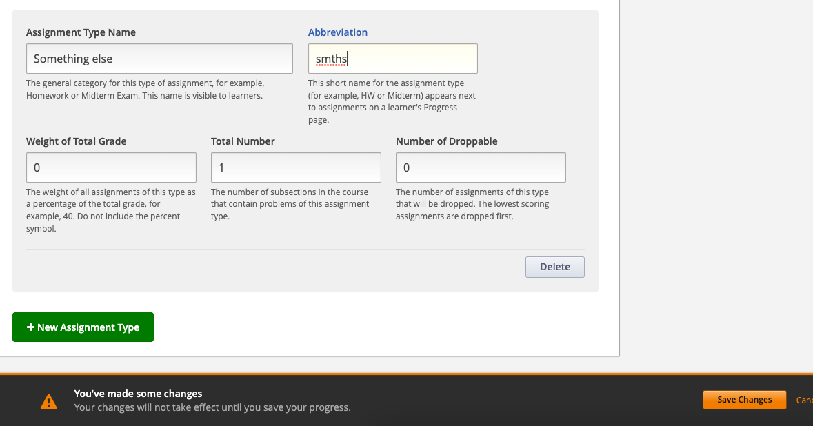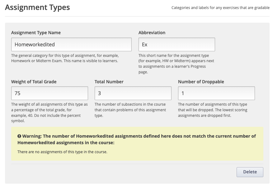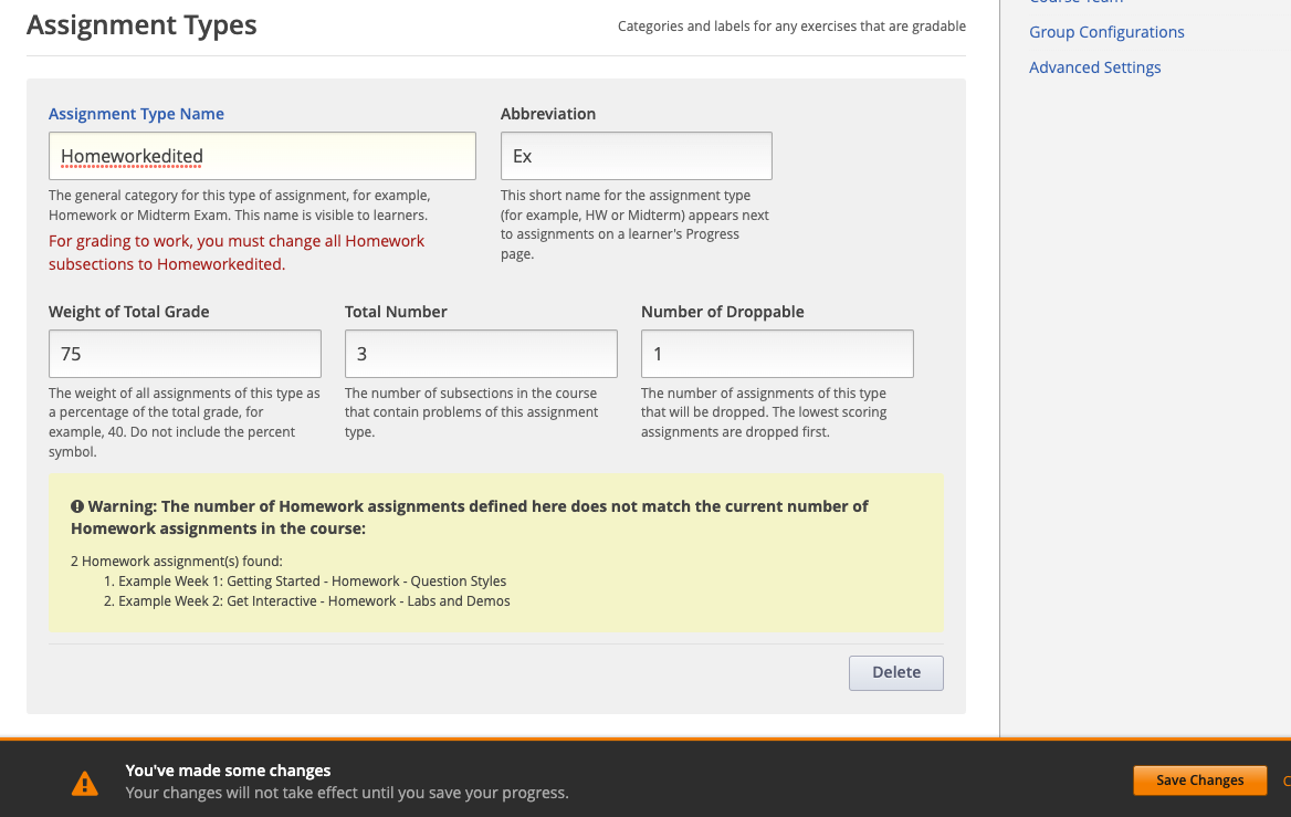 Example Flow #1:An assignment type has one assignment and is defined as having one assignment. It has the corresponding success message (image one). We edit the total number from 1 to 3 (image two). After clicking save, the message is updated to reflect that the number of assignments no longer matches (image three)Example Flow #2:An assignment type has a mismatch of numbers and has the message informing the course author that the numbers do not match. (image 1) we edit the name to "homeworkedited". A non-blocking error message informs us that we will need to change the assignment types of all "homework" assignments in order for grading to work correctly. (image 2) after saving, the warning now states that there are no "homeworkedited" assignments defined in the courseExample flow #3:A user creates a new assignment type. No message, success or otherwise, is displayed when the type is first created (image 1) We put in the assignment type info (image 2) and then after we save we recieve the message that there are no corresponding assignments (image 3)