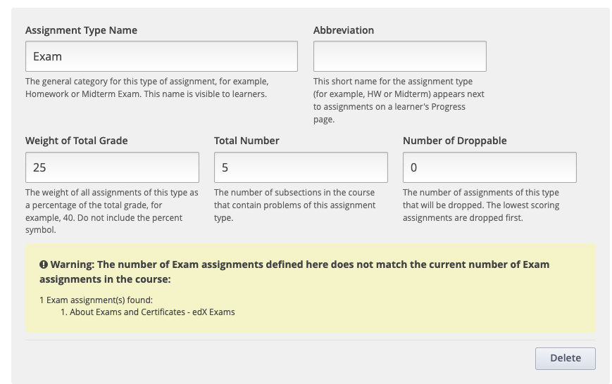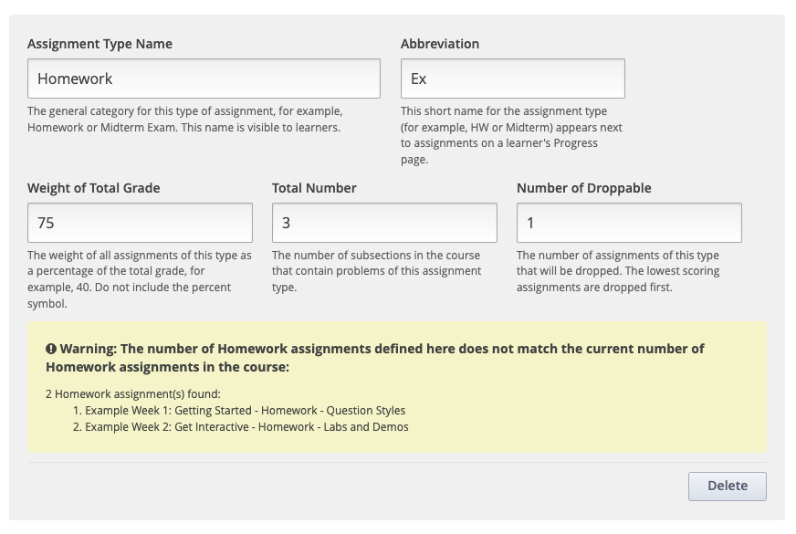 Adds a message warning when the number of counted assignment types within a course don't match with the number defined in the grading config. I also added a corresponding message when the number of assignments matches the defined number.