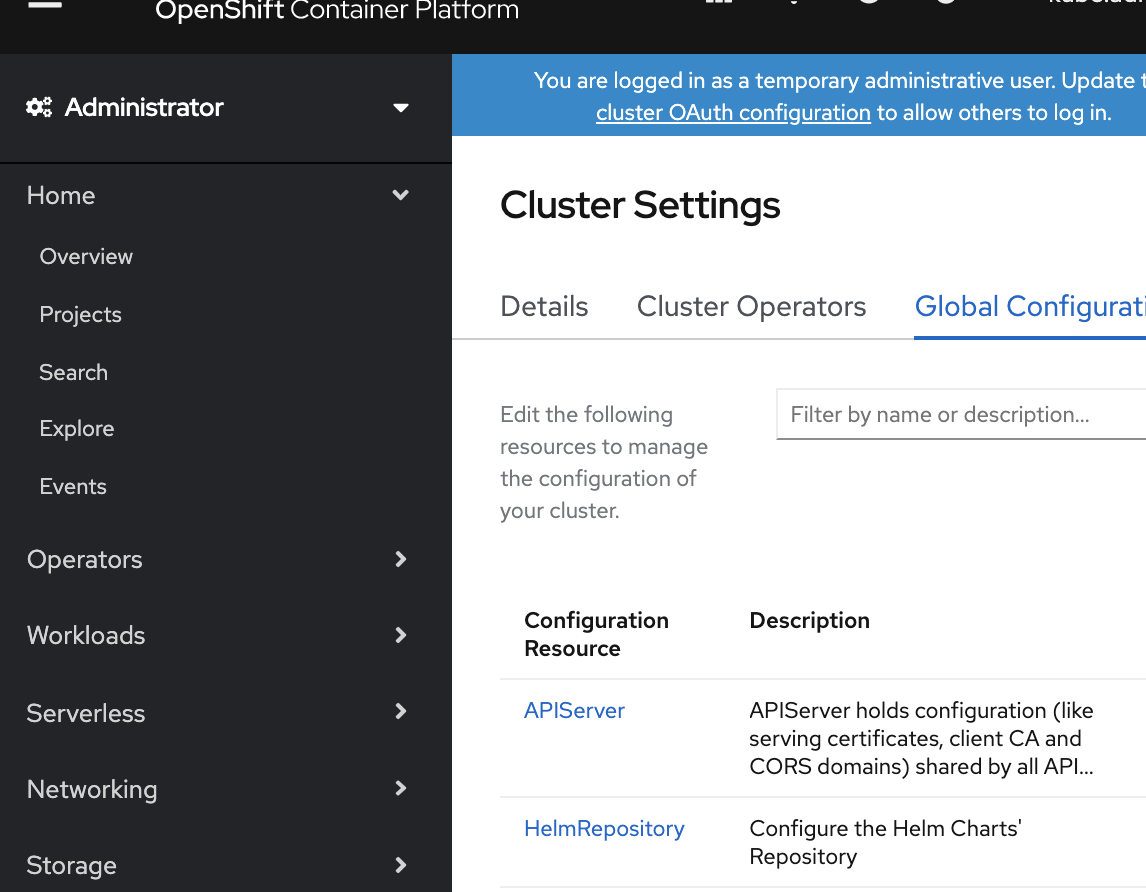 The console backend already implements a few helm endpoints (including the chart proxy), but the future might require to extract them into a separate service (e.g. to make openshift more modular). Hence, it would be good to define the configuration as the standalone resource (possibly cluster-wide or in a dedicated namespace, e.g. |