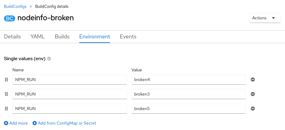 @rottencandy Found an issue: When editing the npm start command and saving the Deployment, the BuildConfig environment variables were added and not replaced:
