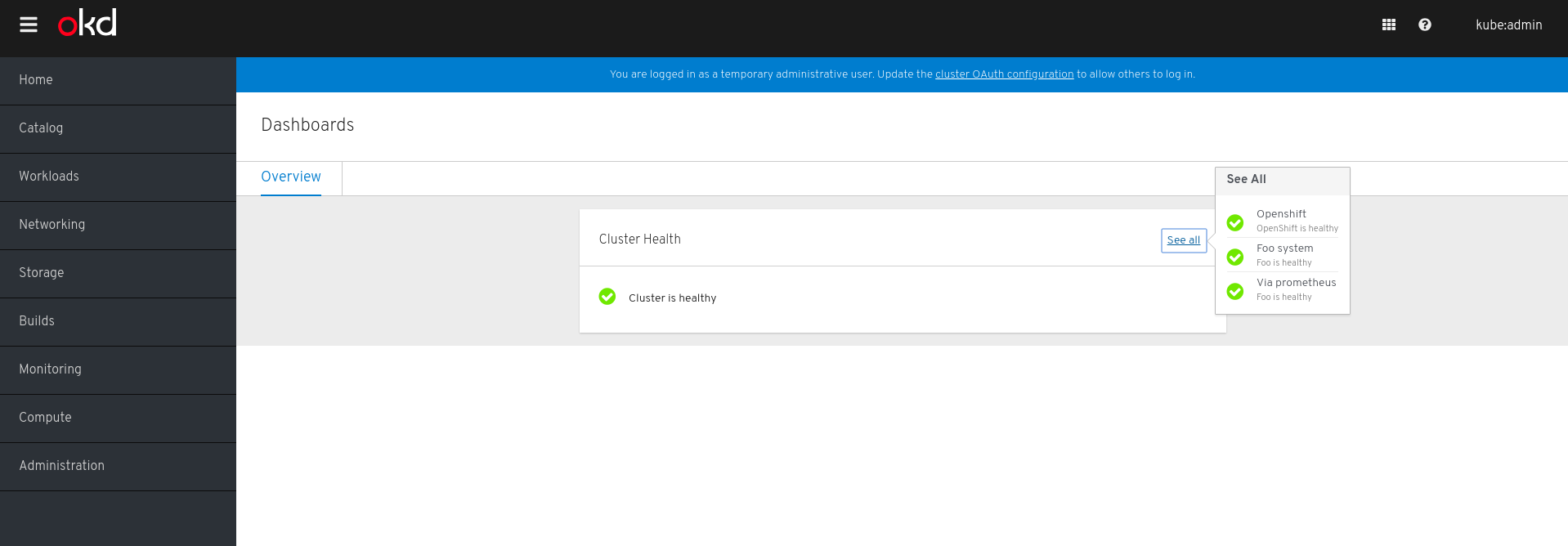Dashboards page currently contains only one tab (Overview) - plan is to be able to contribute other tabs via static extension mechanism. Overview tab contains only one card - Health which can be extended via static plugin mechanism to show healths for other subsystems (ie KubeVirt or Storage).