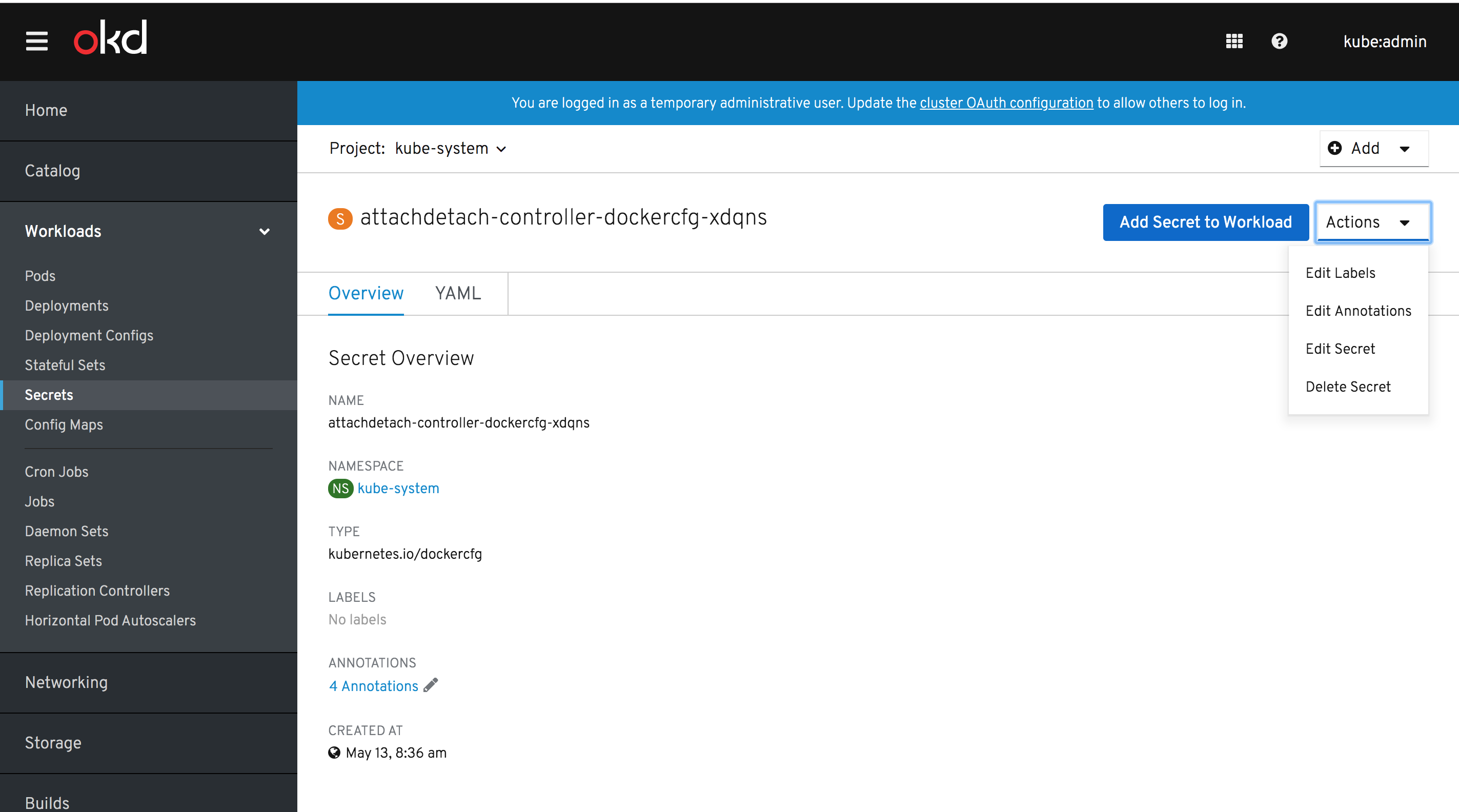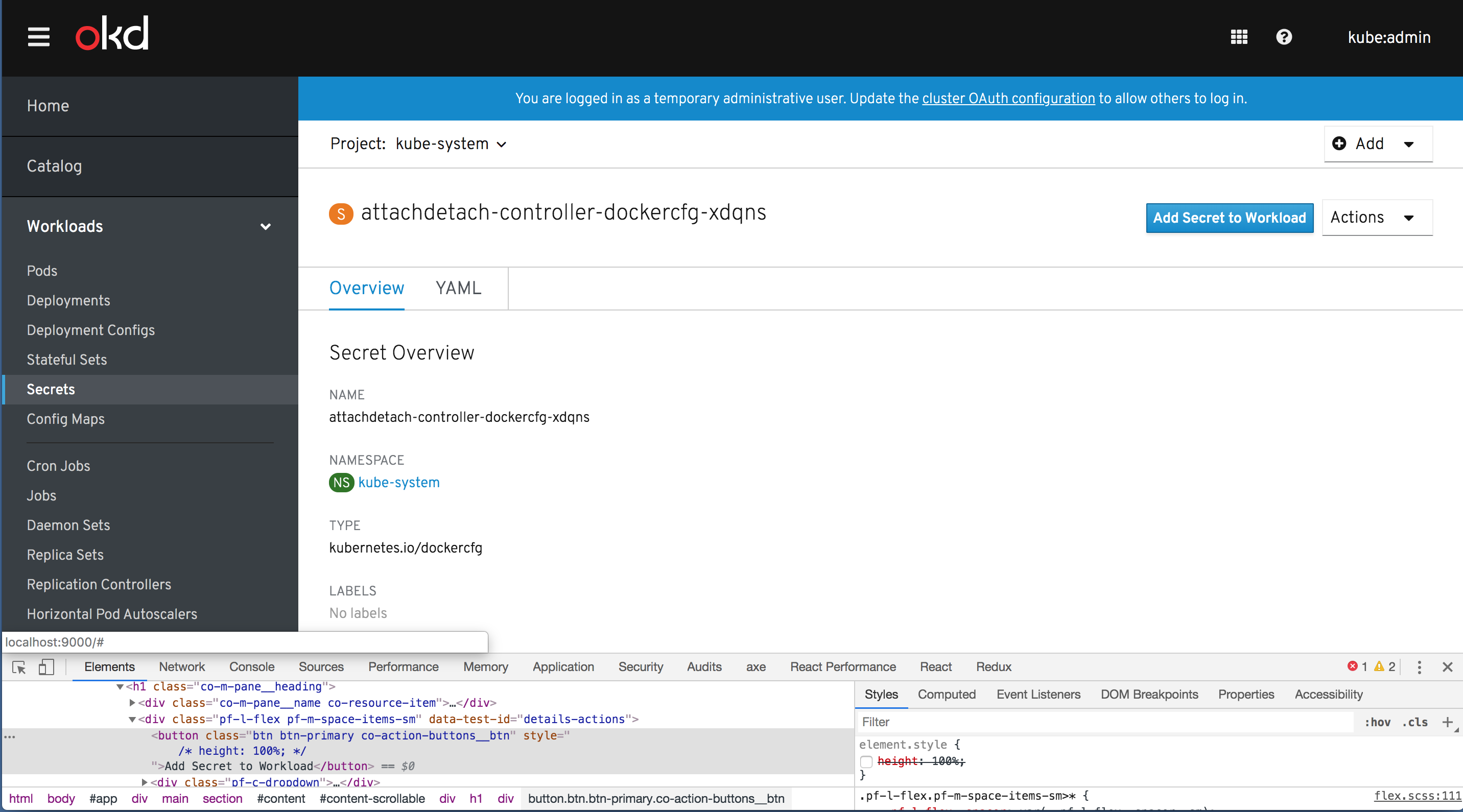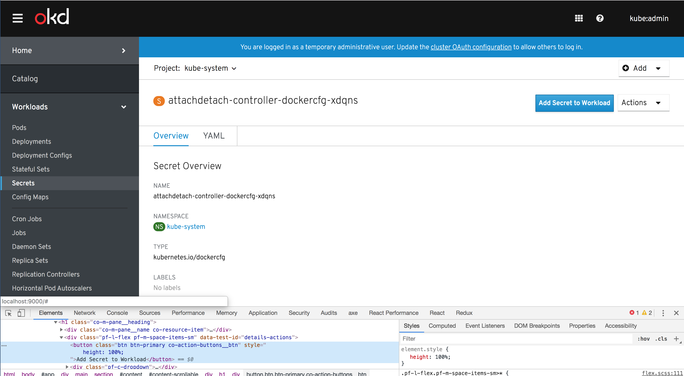 Note: if the "Add Secret to Workload" button remains unchanged and uses Bootstrap styles, it will not match PF4 Dropdown styles. Should we extend the scope of this to include PF4 Button conversion globally? That should not be terrible, even though we have a lot of BS3