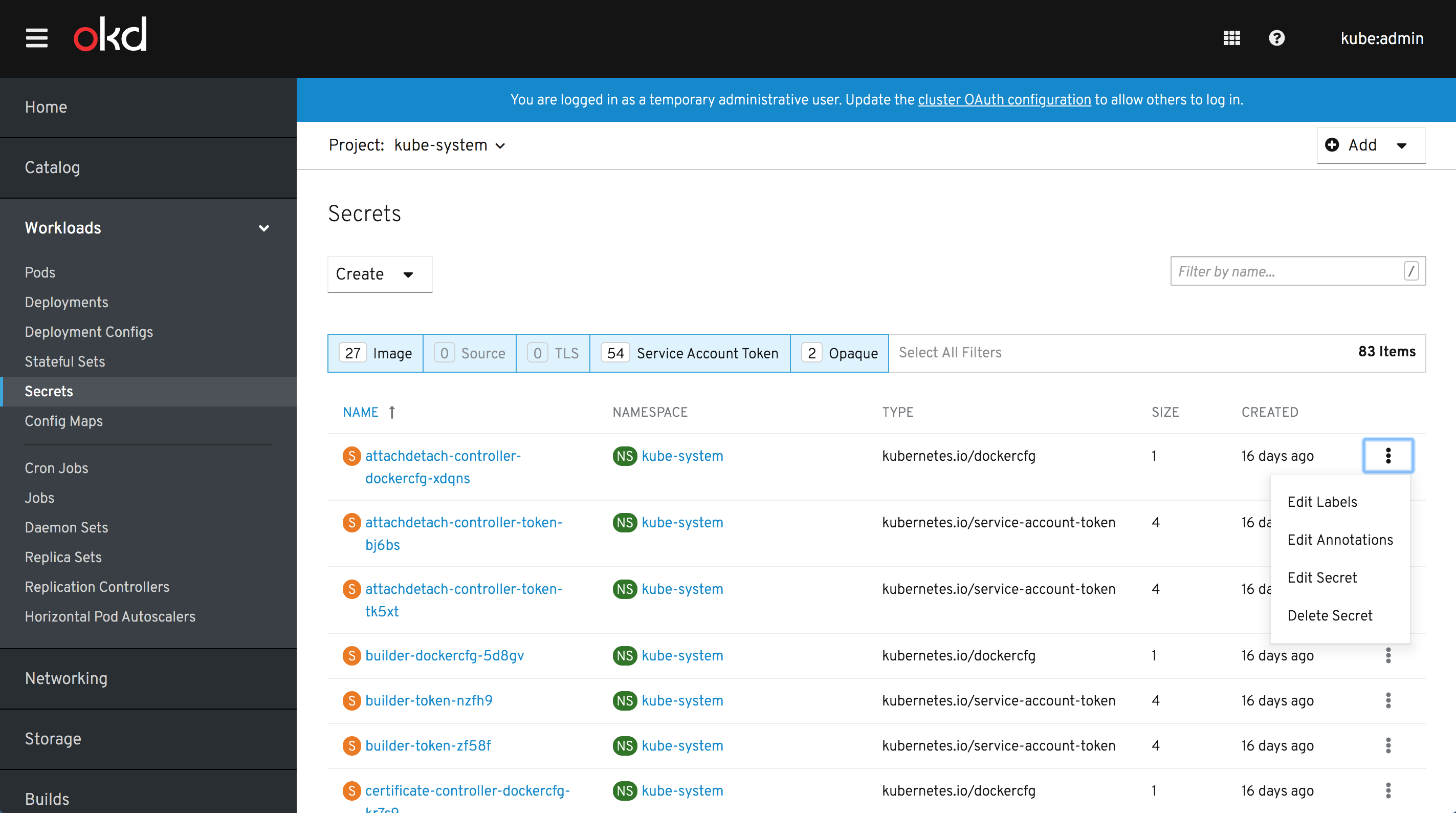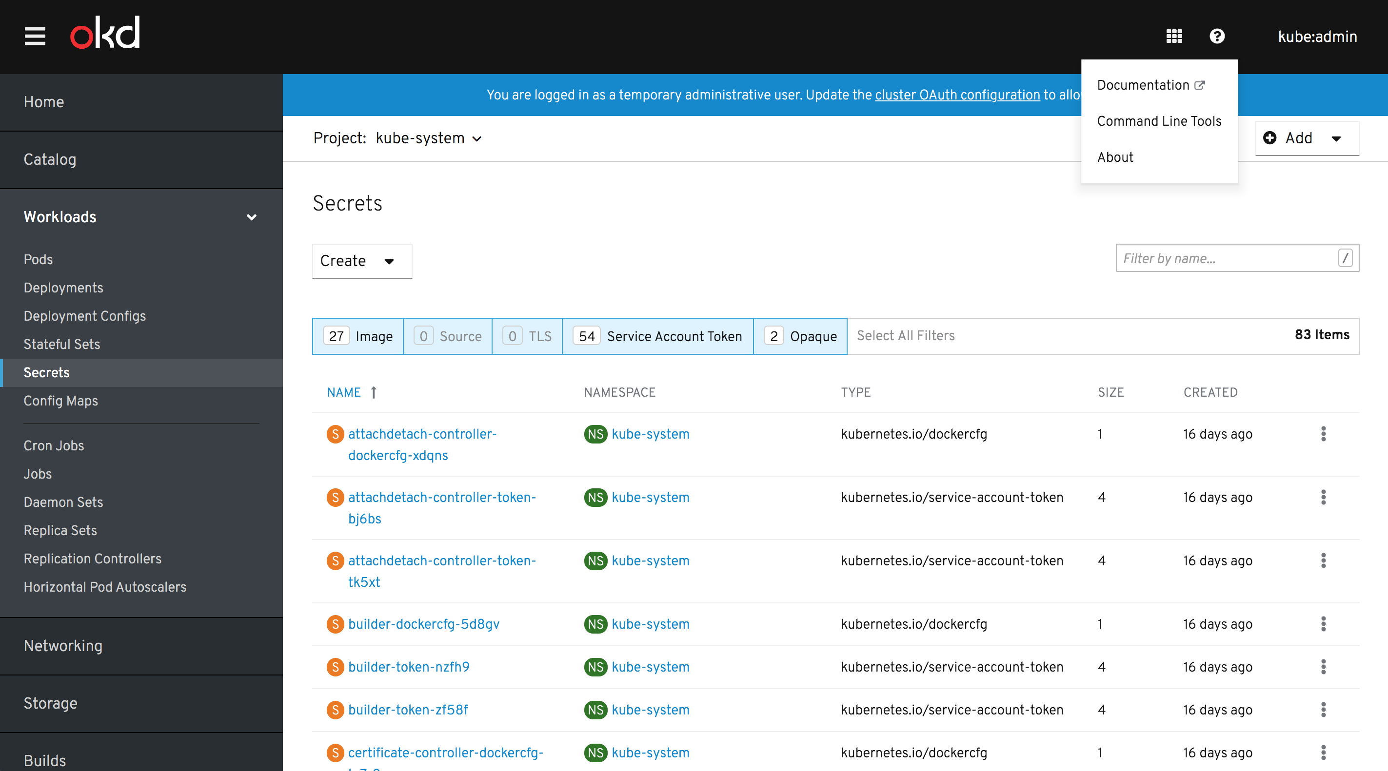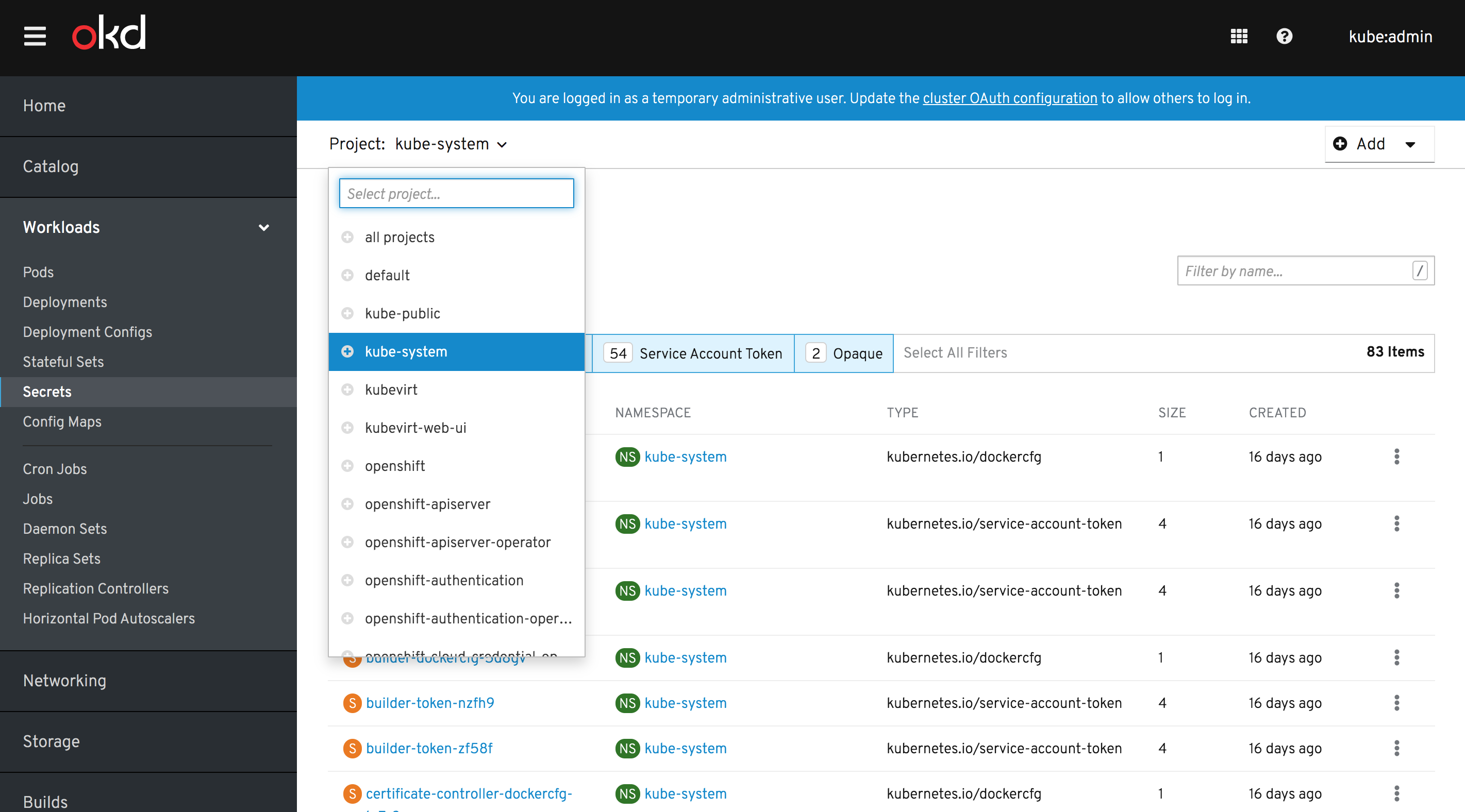 Note: if the "Add Secret to Workload" button remains unchanged and uses Bootstrap styles, it will not match PF4 Dropdown styles. Should we extend the scope of this to include PF4 Button conversion globally? That should not be terrible, even though we have a lot of BS3