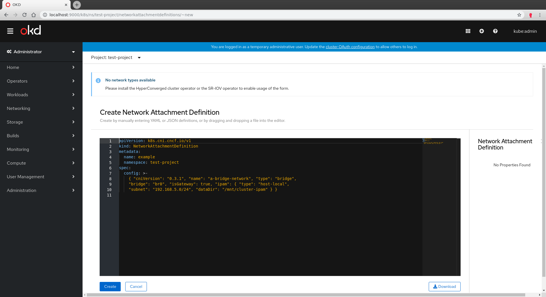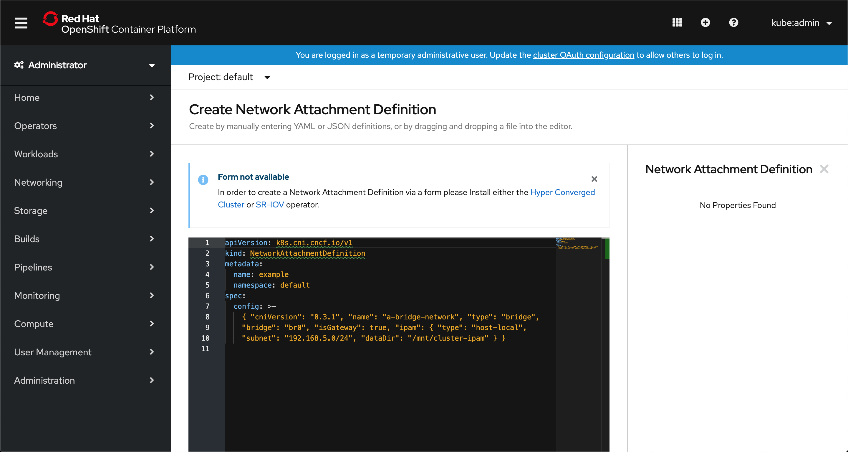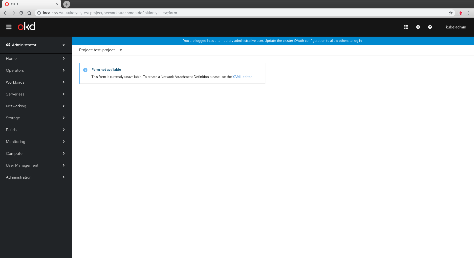 Woah, this is a bit of a surprise. Do we have a user story for this? What is the expected functionality? NetworkAttachDefinitions are low-objects that administrators can use to create additional network interfaces inside pods. However, the network plugins need to be installed by higher-level components. These components, such as HCV , SR-IOV, and others, create NetworkAttachmentDefinitions as part of their networking configuration. However, there's a lot that can go wrong when creating them. You need to understand your addressing requirements. Plugins are cloud-provider and node-hardware specific. We prefer for end-users to create higher-level objects that are interpreted by an operator. That's what we do for SR-IOV, macvlan, and Istio: we manage them with operators. I can't think of a safe way to build them in a simple web form. |