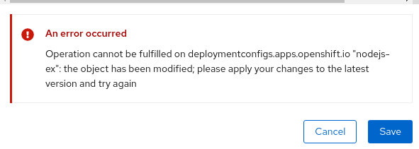 @divyanshiGupta Sometimes the resource object modifies behind the scene and we end up with this error. We have seen this while editing YAML for a resource. For that, there is an option to reload the YAML. Maybe something similar for this as well? cc: @serenamarie125 |