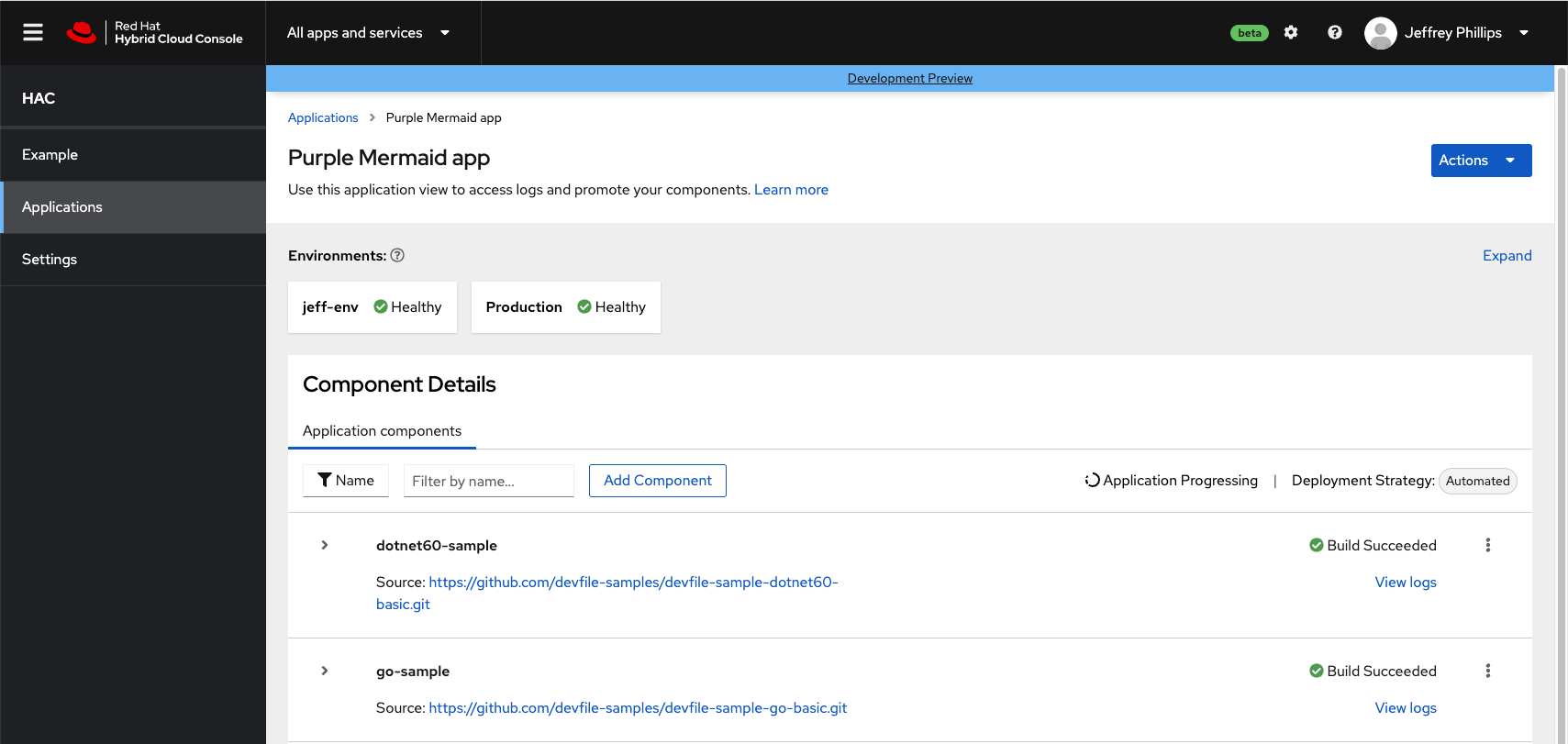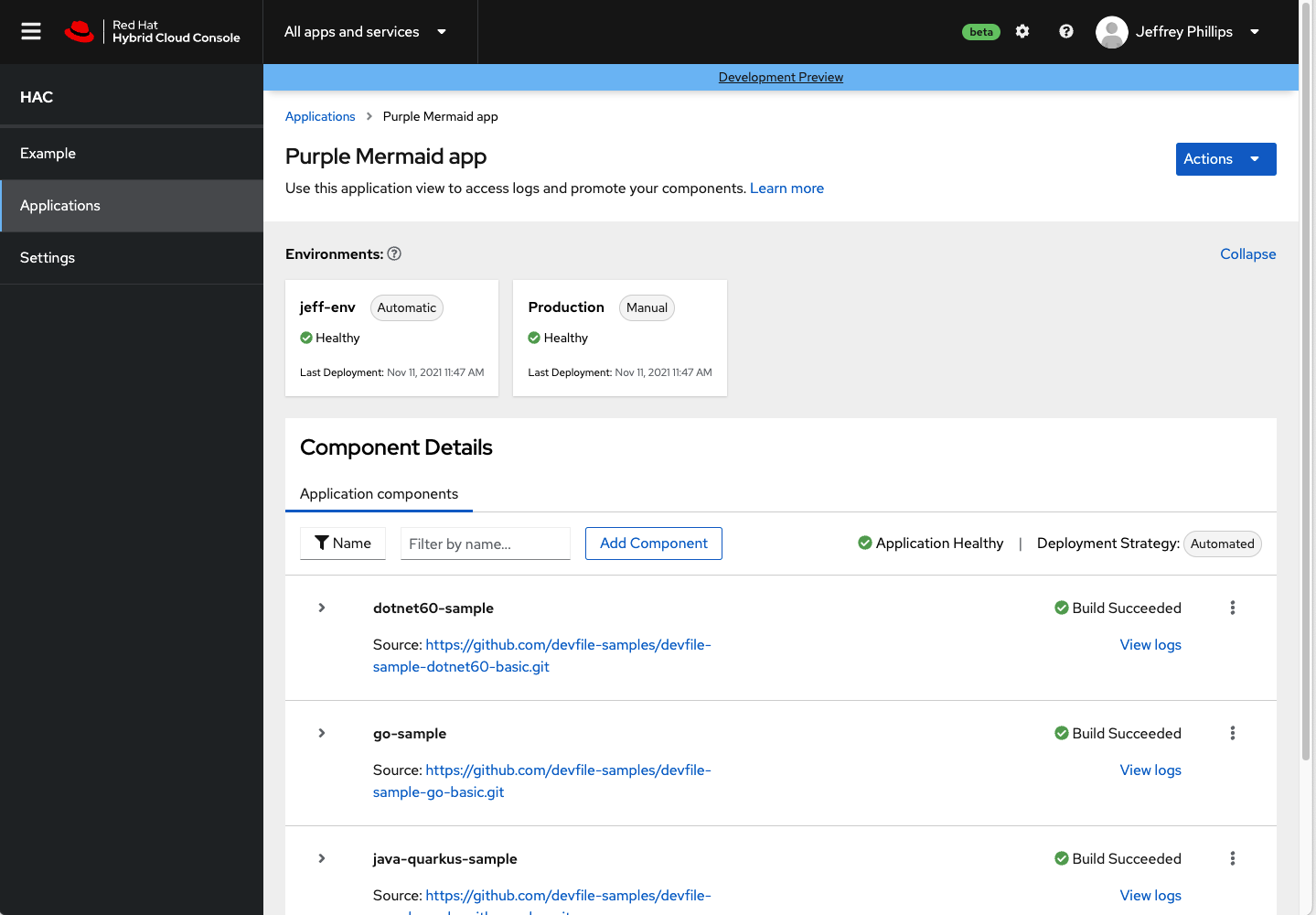 Add an application environment details view showing components in the application. This view is switchable from a list view to a topology graph view with a side panel showing more details for the selected component.