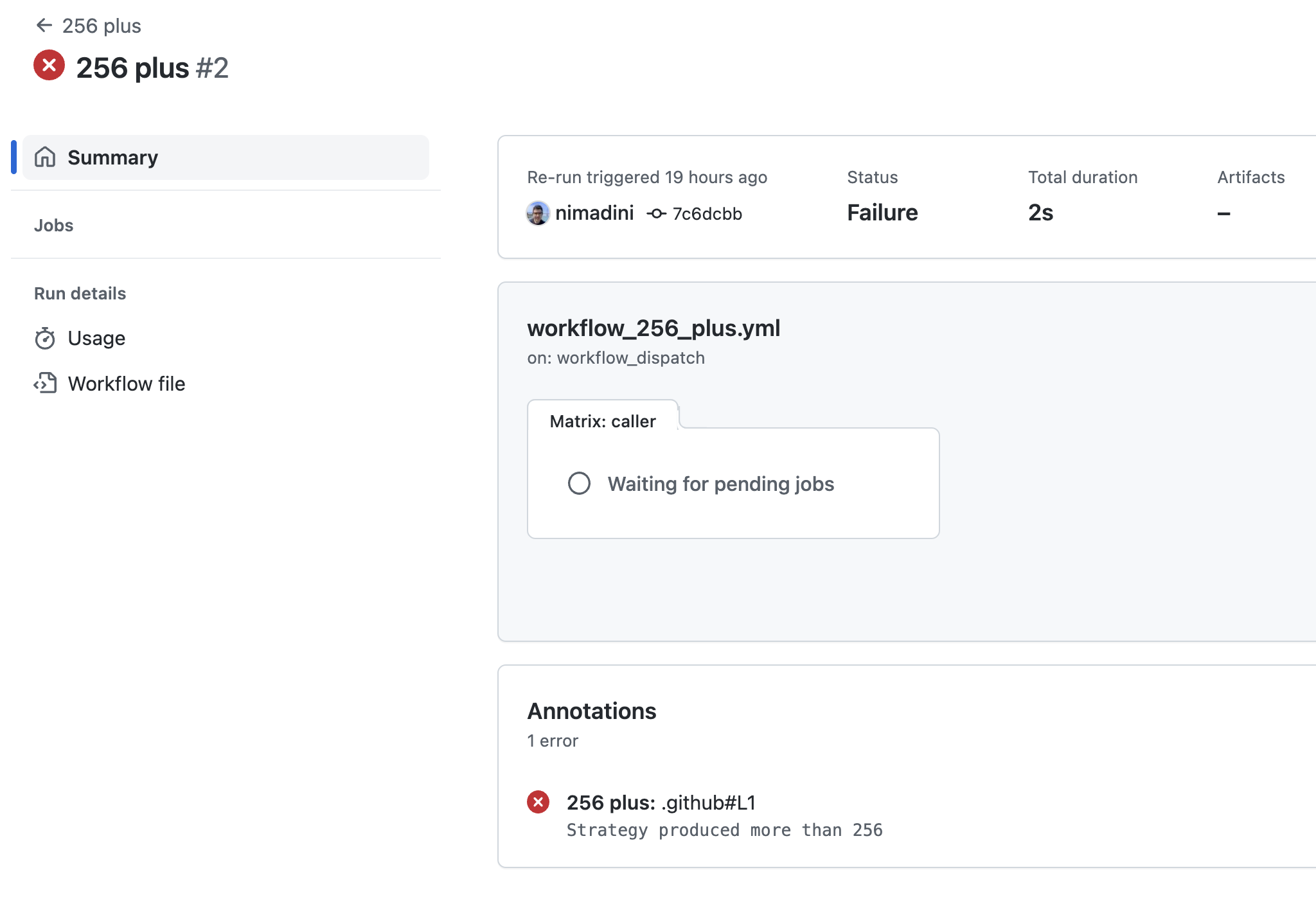 256matrix jobs per workflow run, which I verified is indeed enforced.However, with re-usable workflows, both the caller and the called workflow can define a matrix (even though I can't find it in the docs), which collectively can easily surpass the