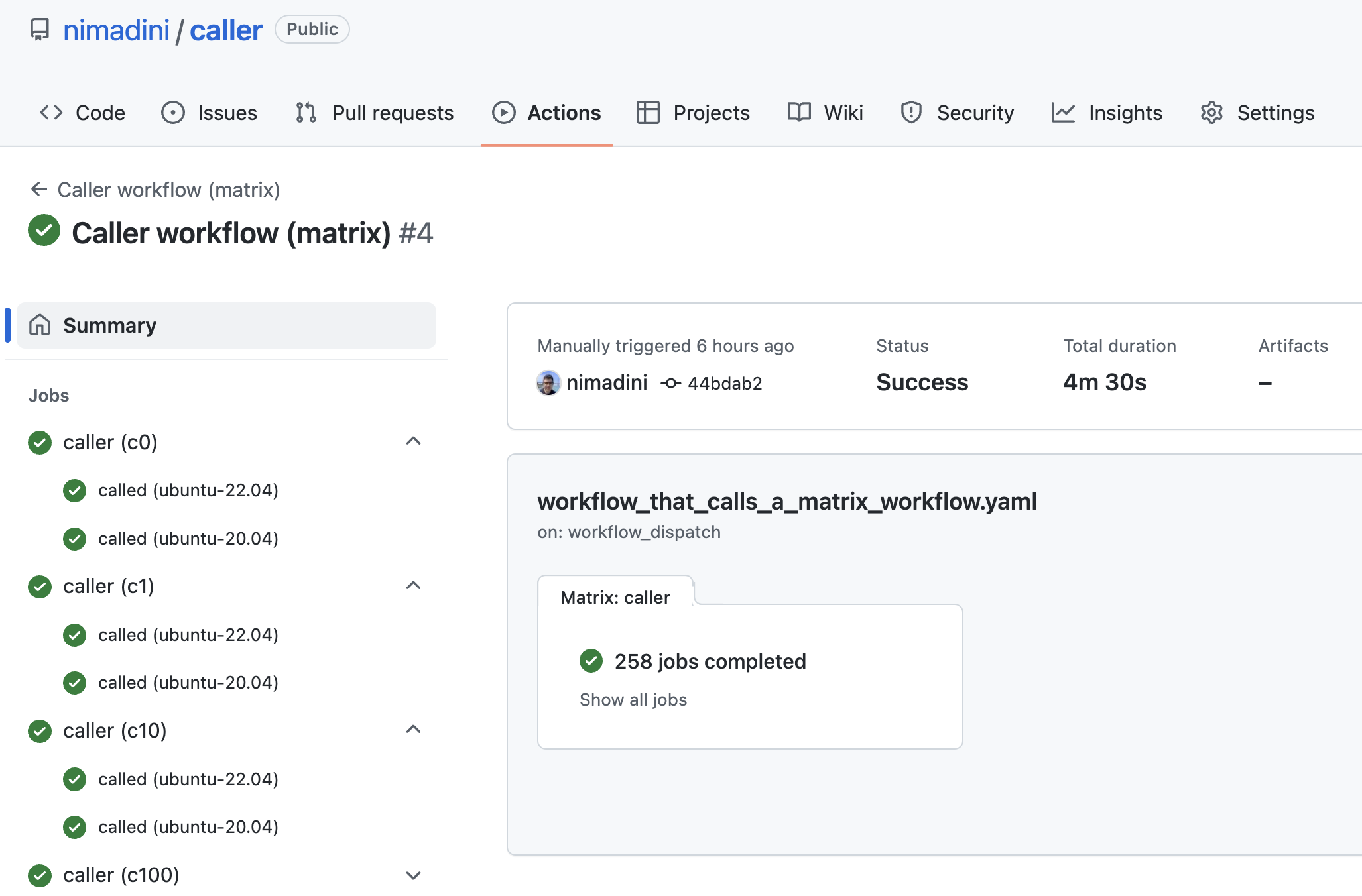 256limit, and GitHub allows it! For example, here is a successful workflow run with129 * 2 = 258matrix jobs (129from the caller and2from the called workflow).Nesting workflows up to 4 levels, one can in theory run