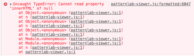 Uncaught TypeError: Cannot read property 'innerHTML' of null traced back to the following line patternlab-viewer.js:formatted:6047