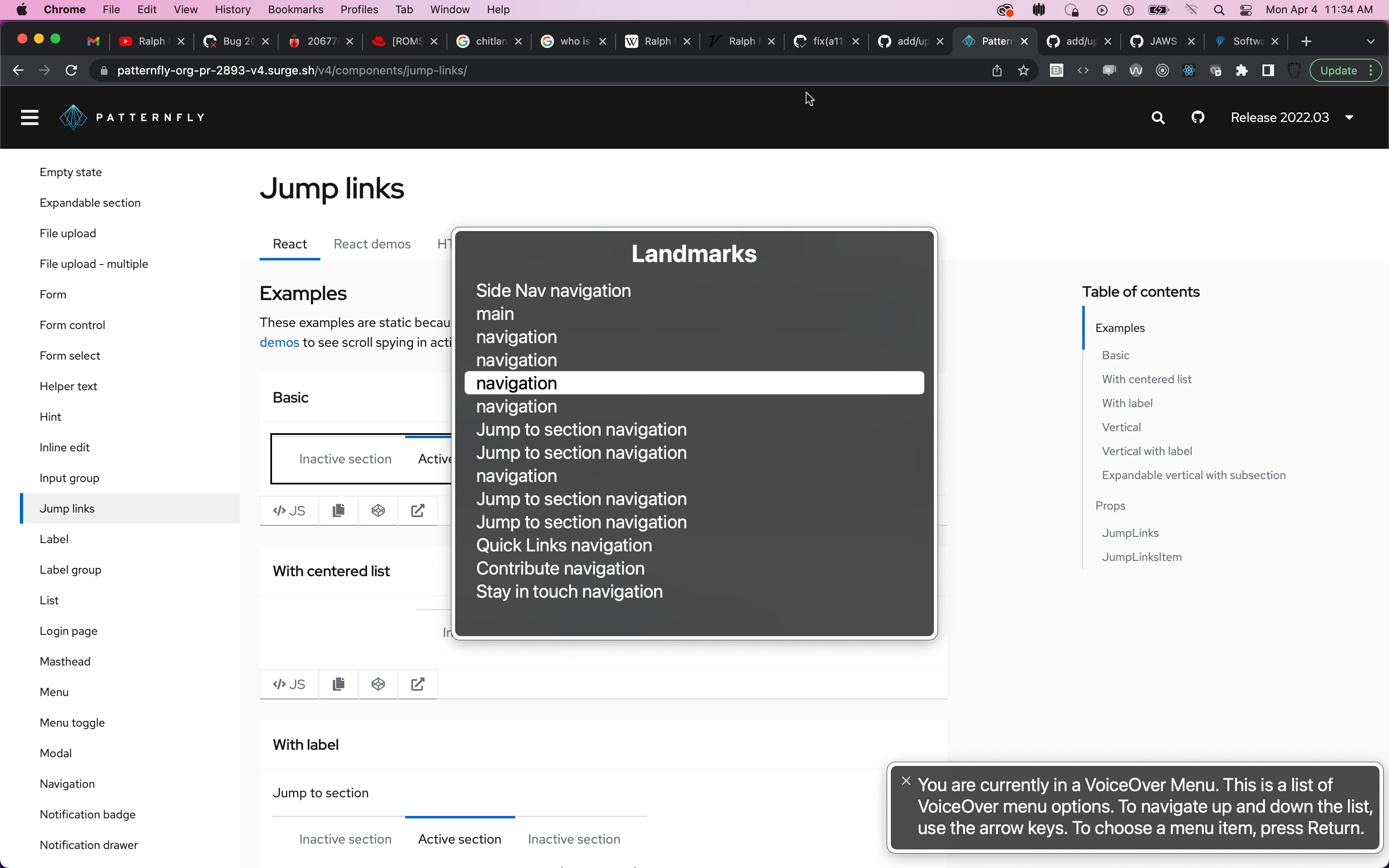 It looks like the links in the Jump Links page aren't in VO rotor due to not having an href passed in. Once that gets passed in they show up. Though via the rotor there's no indication which is active, so adding the verbiage regarding "on focus" I'd agree could be worth adding for that.