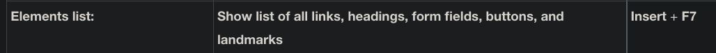 Do you think its worth it to also mention if users should expect these contents to be announced via screen reader element cursor vs rotor menu (or whatever the equivalent is called in NVDA/JAWS)? Just wondering if it could be confusing to a newcomer that reads this and thinks "ok but how do I verify or ensure that SRU can discern this expectedly?".
