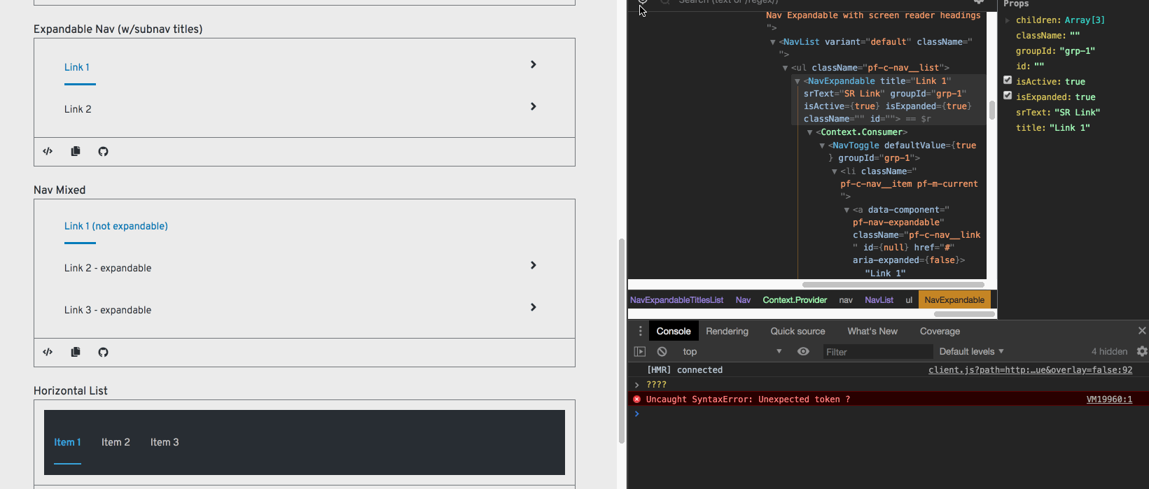 Setting the value of isExpanded to true or false does not expand or collapse the nav list items. When NavToggle is manually selected, it calls this.setState({ value: !value }); from within handleToggle. This successfully toggles the NavExpandable open and close. We would like to be able to set the value of isExpanded programmatically by passing/setting props. Currently, this option isn't available.