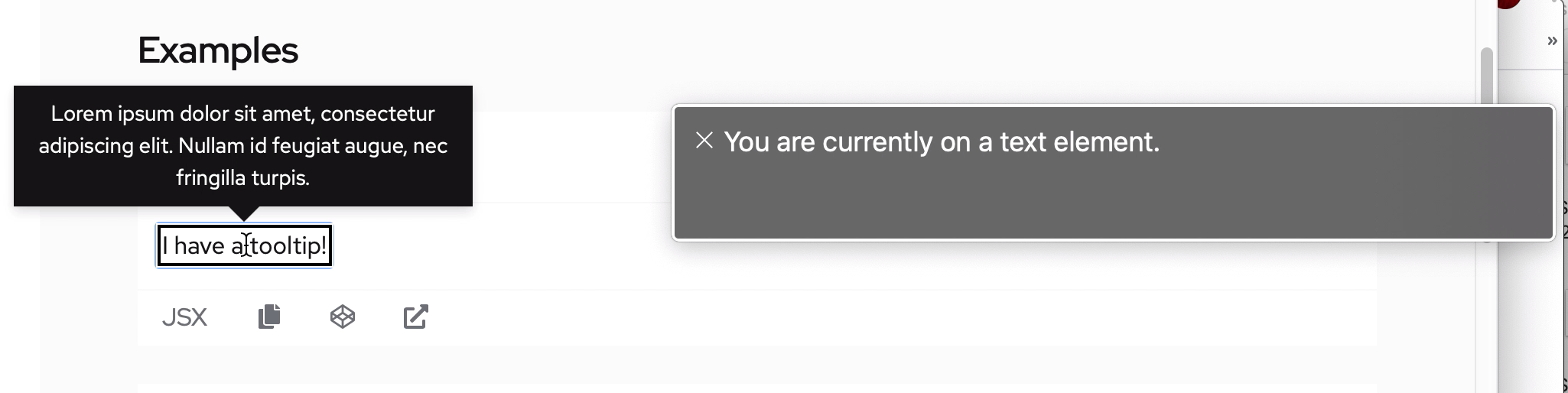 The tooltip examples don't seem to be read in VO when using Safari, except for the positions example. I've noticed that it does currently work in Chrome, but seems to have some difficulty in Safari. It only reads the item that the tooltip is on and then tells you what type of element it is. So in this case, it reads "I have a tooltip" then "You are currently on a text element." I would expect it to read out the tooltip as well.